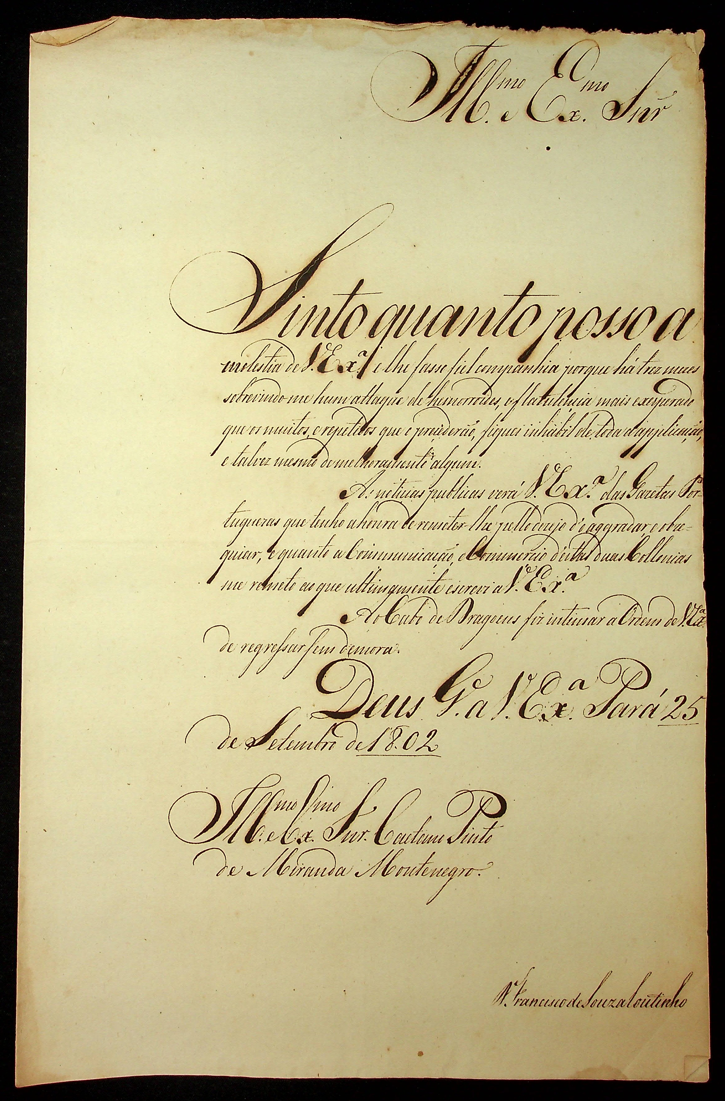 CARTA do [Governador e Capitão-General da Capitania do Grão Pará e Maranhão] Francisco de Souza Coutinho ao [Governador e Capitão General da Capitania de Mato Grosso] Caetano Pinto de Miranda Montenegro.