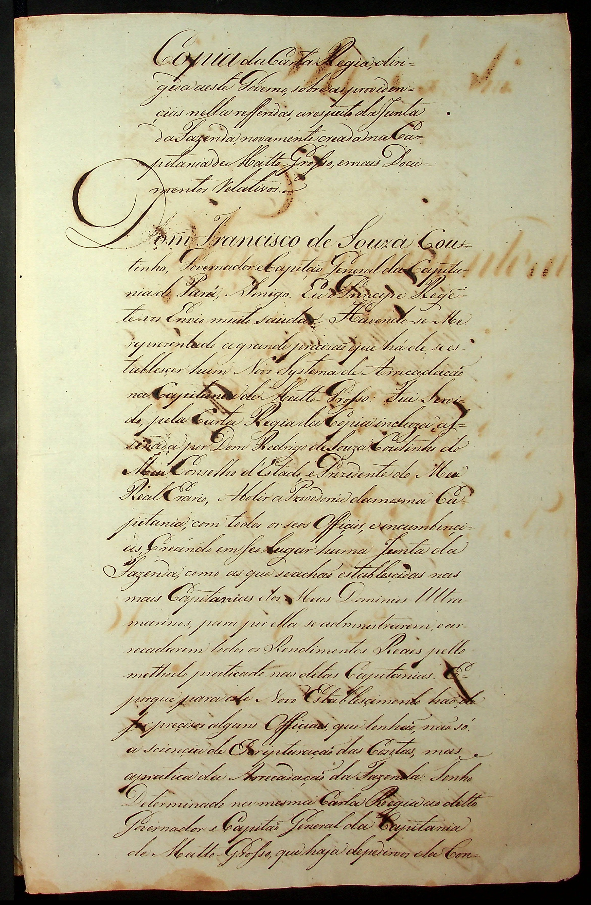 CARTA do [Governador e Capitão-General da Capitania do Grão Pará e Maranhão] Francisco de Souza Coutinho ao [Governador e Capitão General da Capitania de Mato Grosso] Caetano Pinto de Miranda Montenegro.