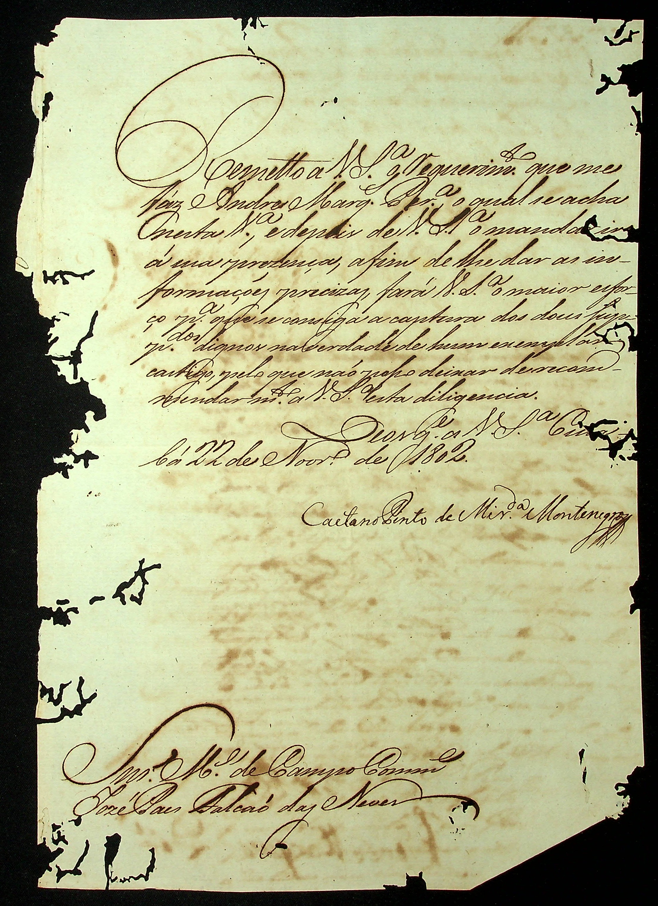 CARTA do [Governador e Capitão General da Capitania de Mato Grosso] Caetano Pinto de Miranda Montenegro ao Mestre de Campo da Vila do Cuiabá José Paes Falcão das Neves.