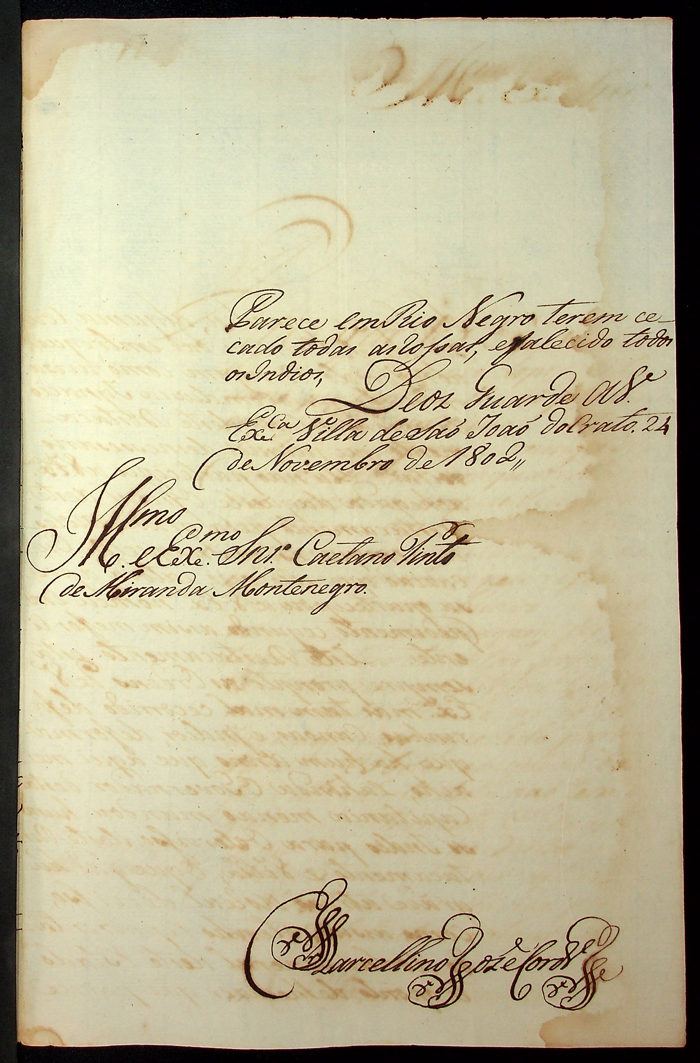 CARTA do [Comandante do Destacamento da Vila de São José do Crato] Marcelino José Cordeiro ao [Governador e Capitão General da Capitania de Mato Grosso] Caetano Pinto de Miranda Montenegro.