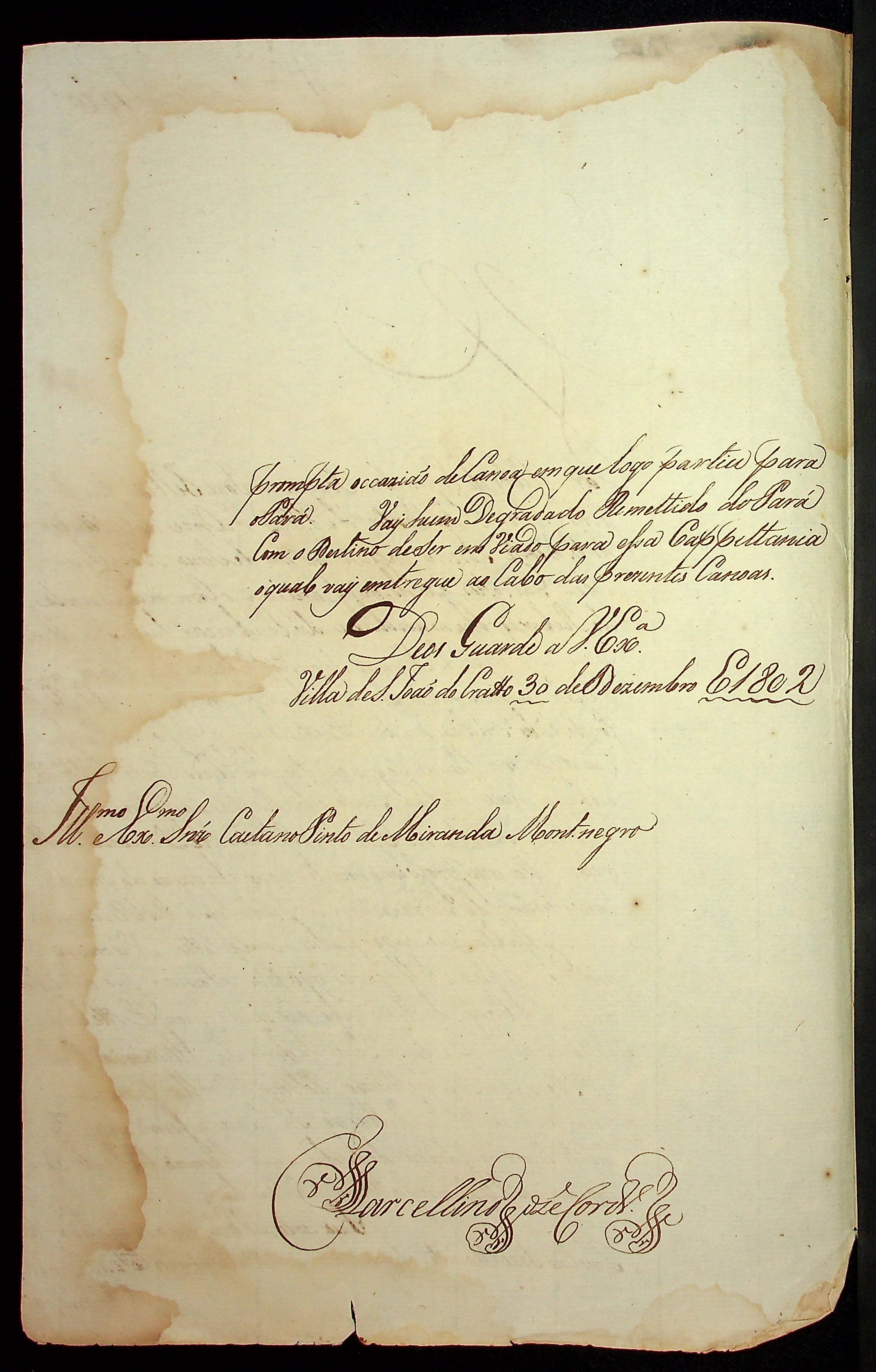 CARTA do [Comandante do Destacamento da Vila de São José do Crato] Marcelino José Cordeiro ao [Governador e Capitão General da Capitania de Mato Grosso] Caetano Pinto de Miranda Montenegro.