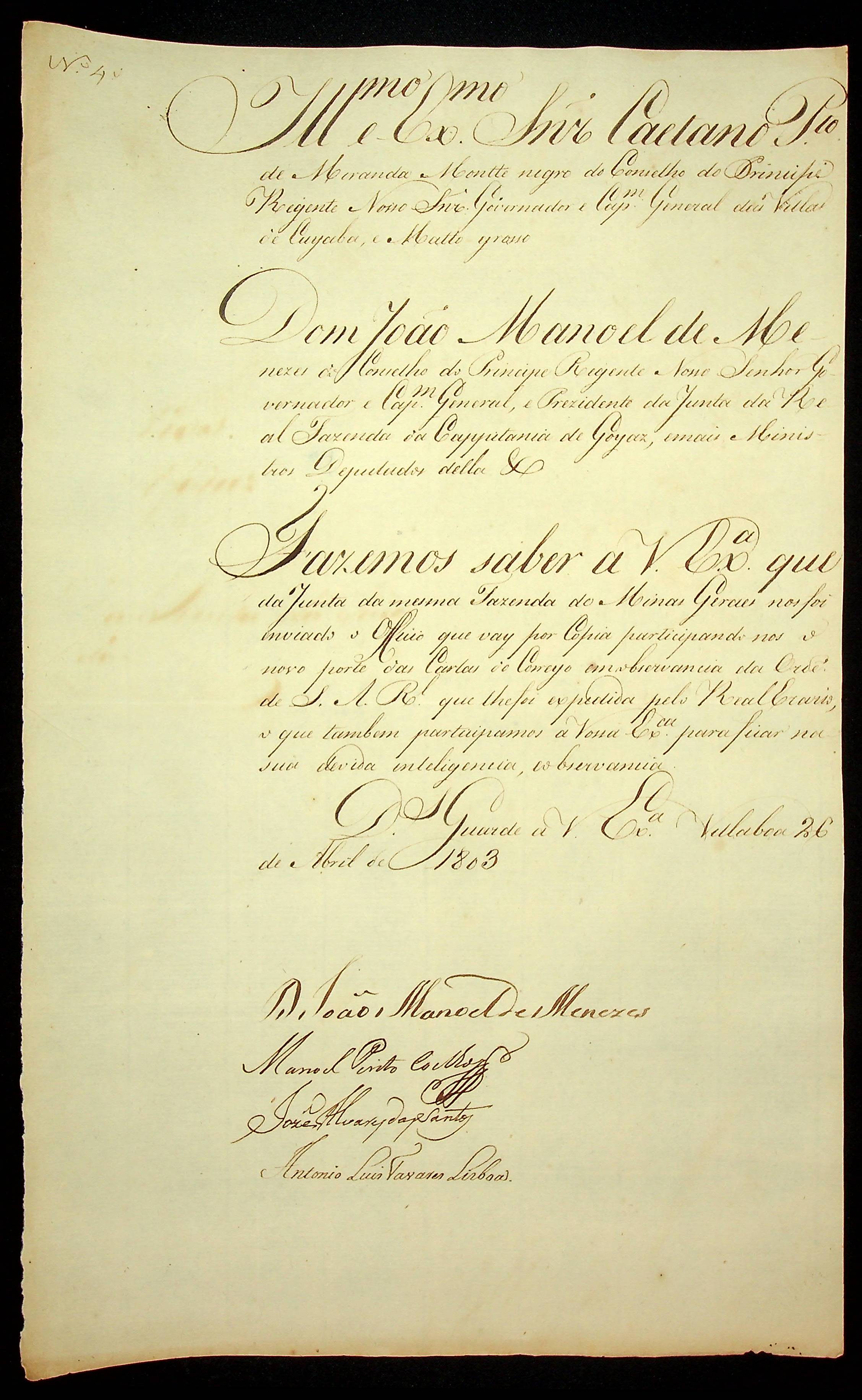 CARTA do [Governador e Capitão-General da Capitania de Goiás] João Manoel de Meneses e demais membros da Junta da Fazenda de Goiás ao Governador e Capitão-General da Capitania de Mato Grosso Caetano Pinto de Miranda e Montenegro.