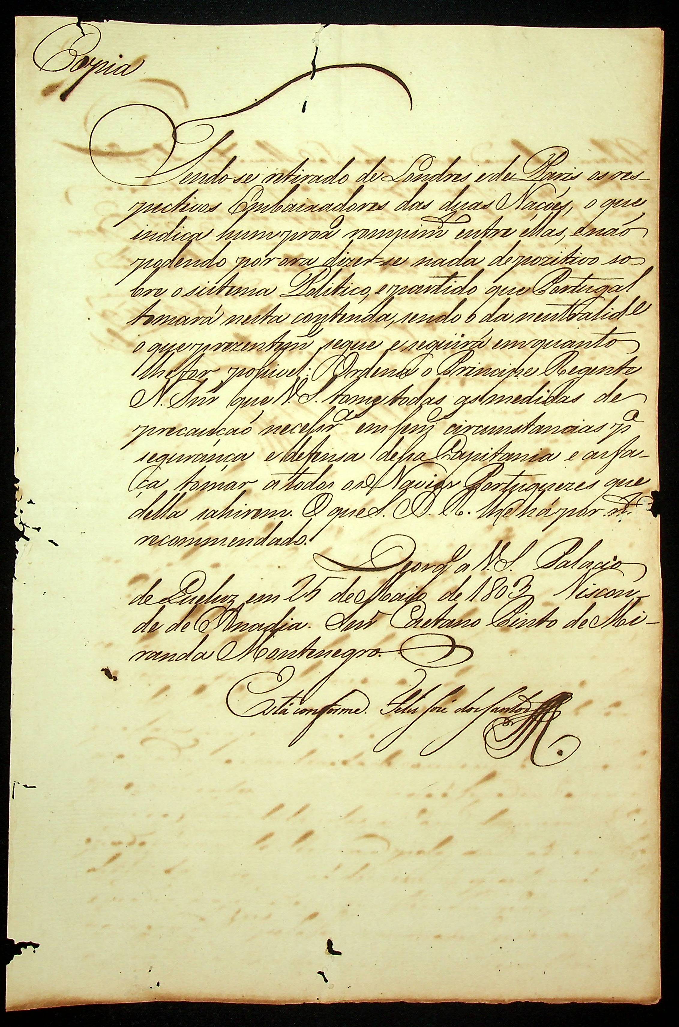 CARTA (cópia)do Visconde de Anadia ao Governador e Capitão General da Capitania de Mato Grosso [Caetano Pinto de Miranda Montenegro].