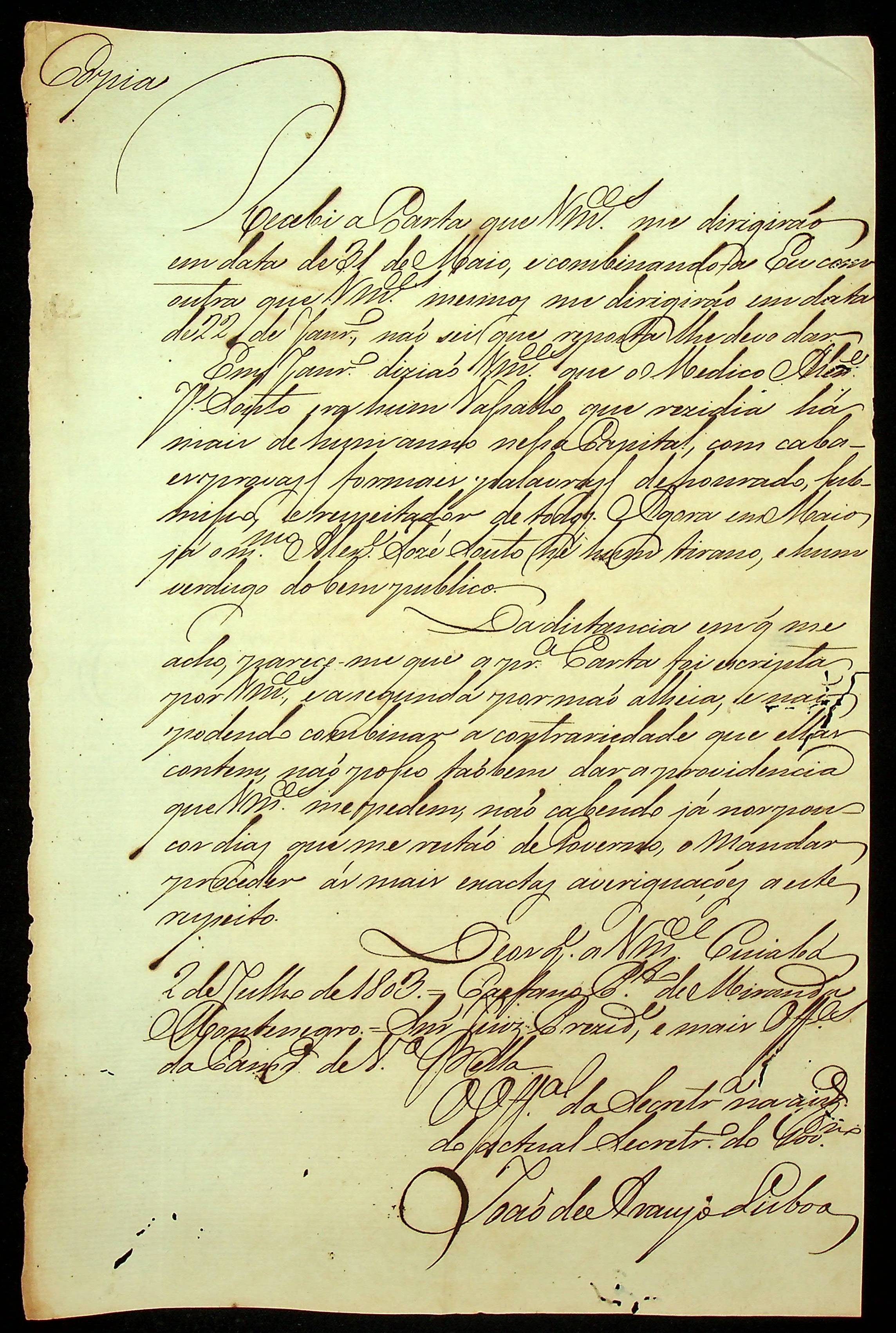 CARTA do [Governador e Capitão General da Capitania de Mato Grosso] Caetano Pinto de Miranda Montenegro ao Juiz Presidente e mais oficiais da Câmara de Vila Bela.