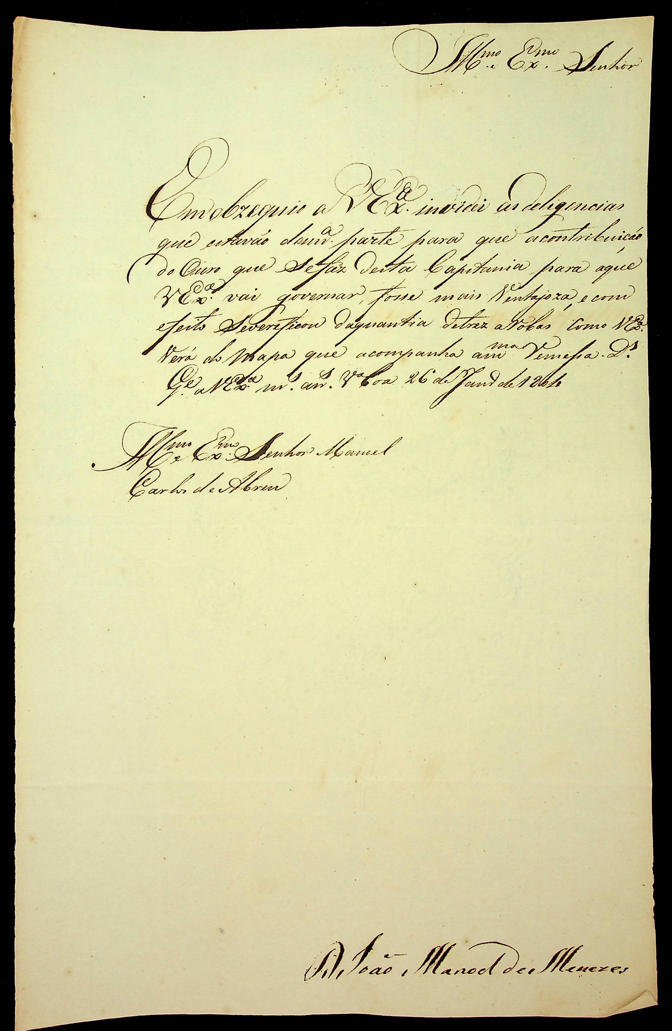 CARTA de João Manoel de Menezes ao [Governador e Capitão-General da Capitania de Mato Grosso] Manoel Carlos de Abreu e Menezes.