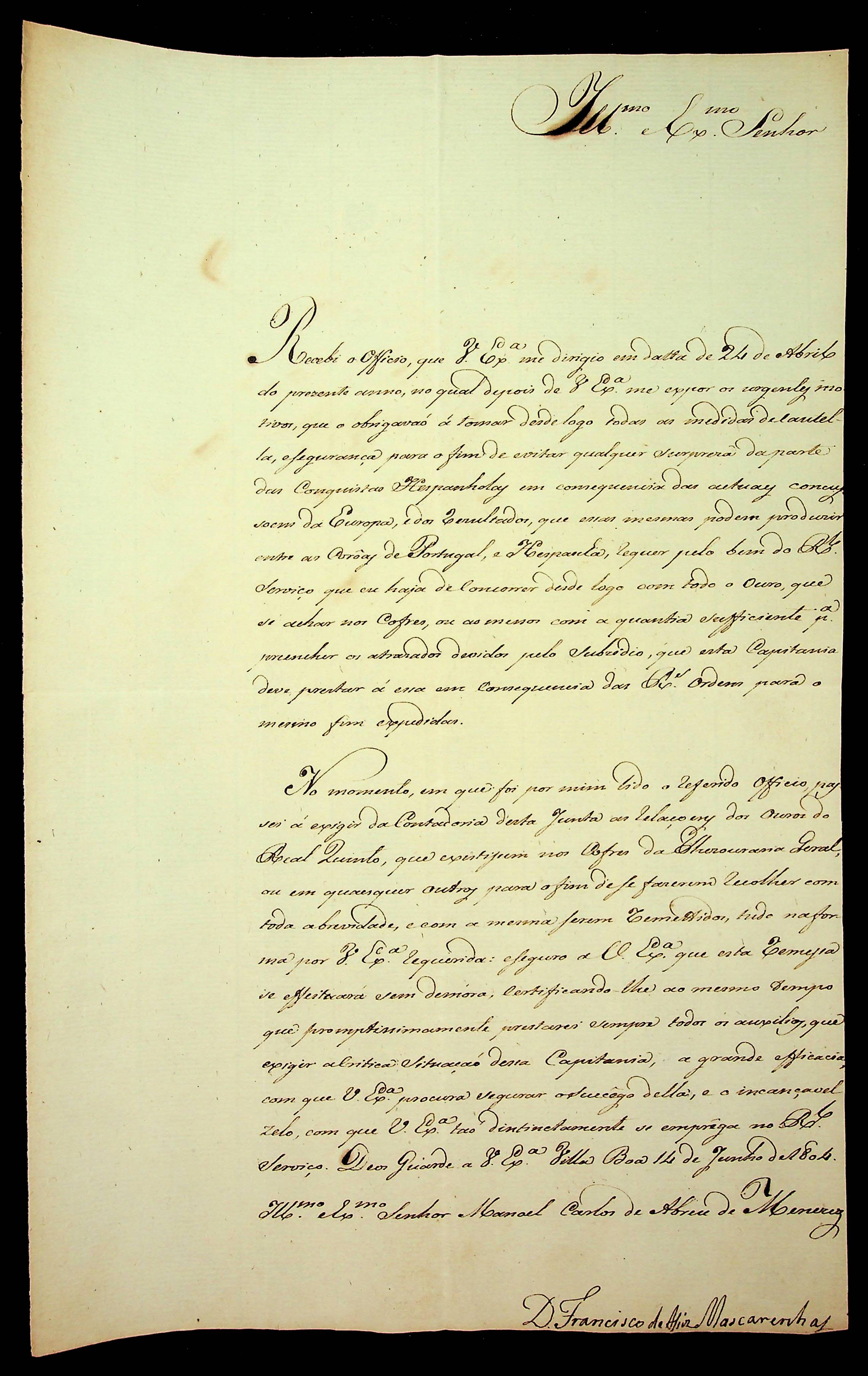 CARTA do [Governador e Capitão-General da Capitania de Goiás] Francisco de Assis Mascarenhas ao [Governador e Capitão-General da Capitania de Mato Grosso] Manoel Carlos de Abreu e Menezes.