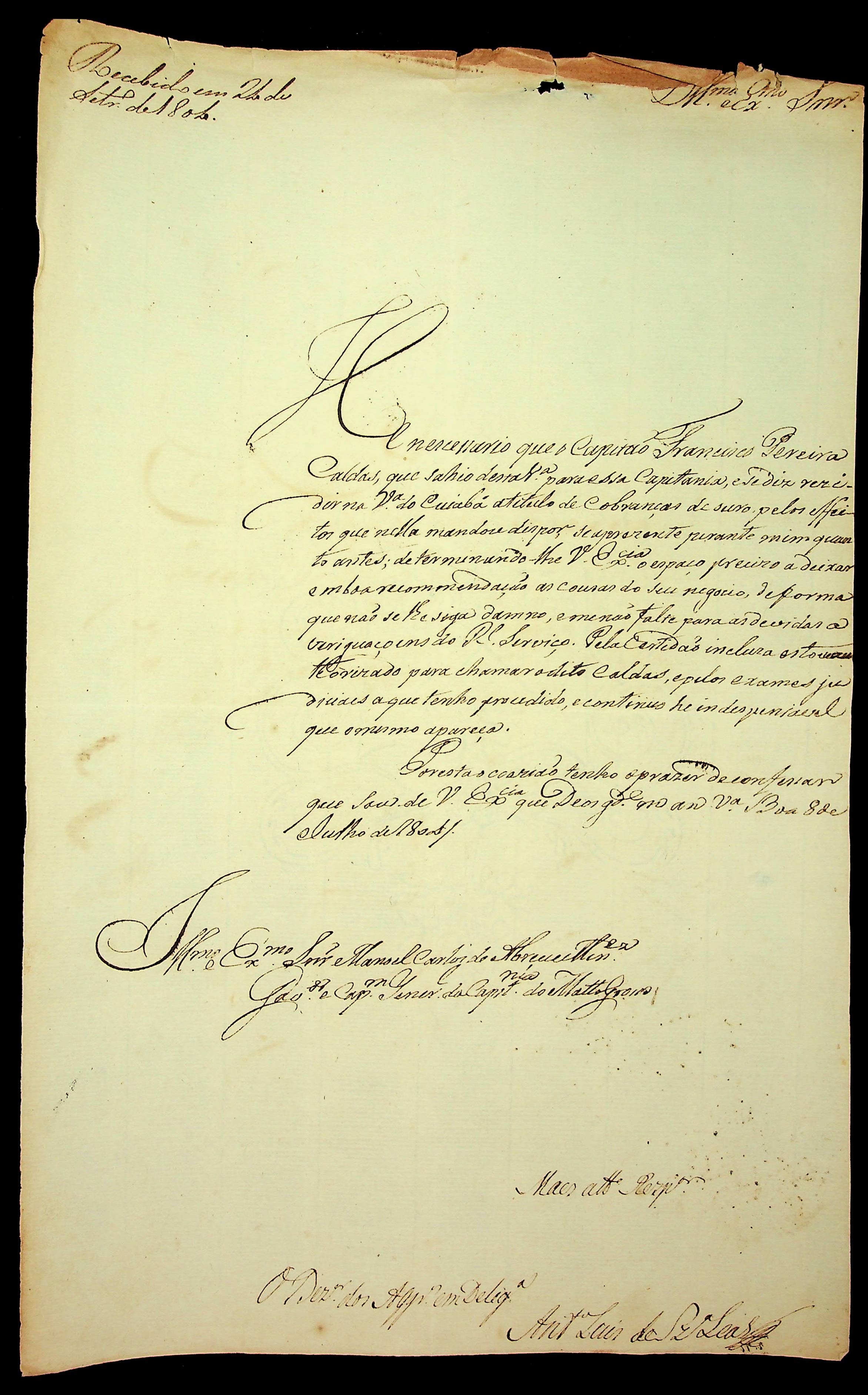 CARTA do Desembargador Antônio Luiz de Souza Leal ao Governador e Capitão-General da Capitania de Mato Grosso Manoel Carlos de Abreu e Menezes.