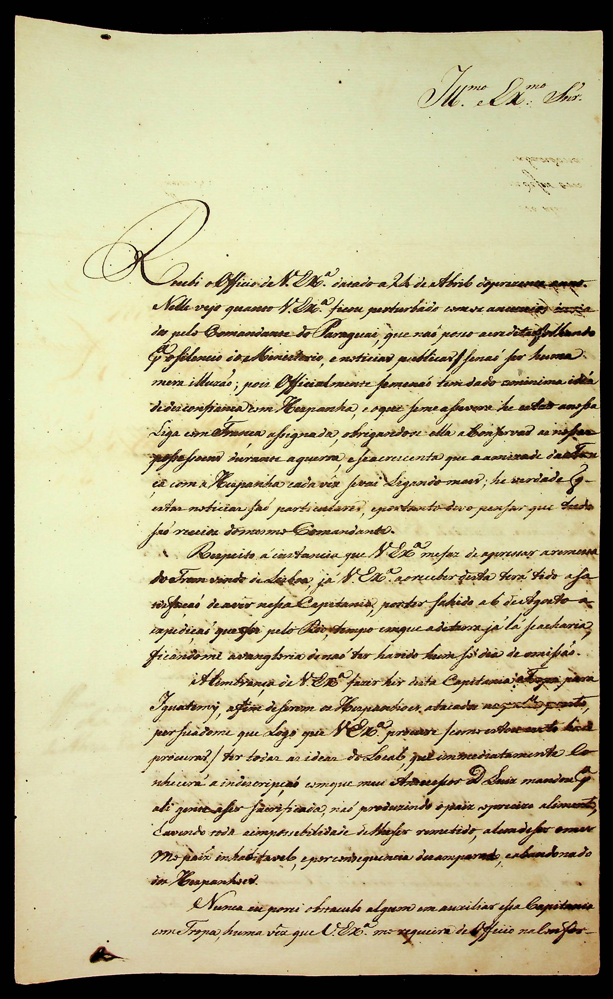 CARTA do [Governador e Capitão-General da Capitania de São Paulo] Antônio José da França e Horta ao [Governador e Capitão-General da Capitania de Mato Grosso] Manoel Carlos de Abreu e Menezes.