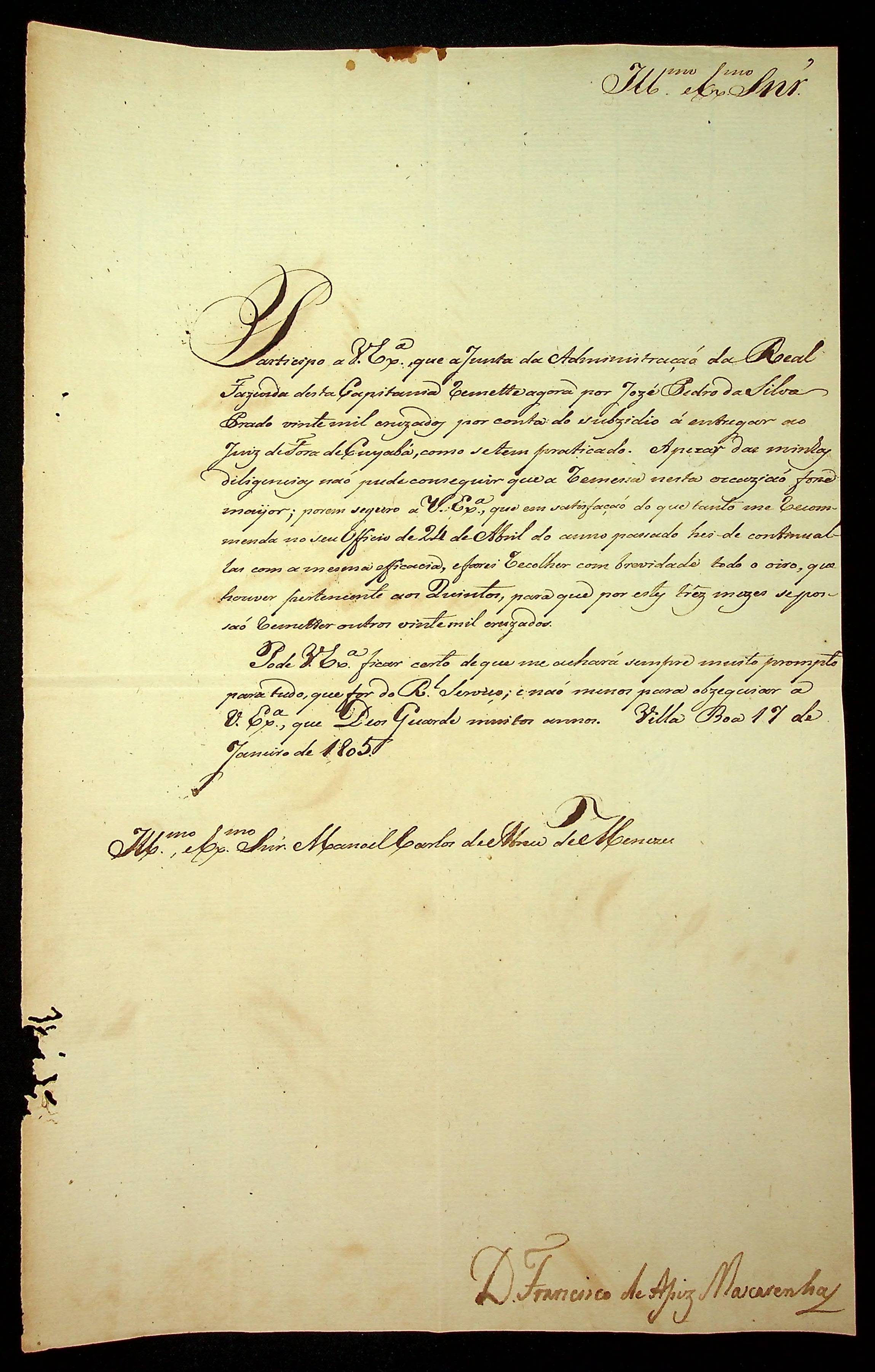 CARTA de Francisco de Assis Mascarenhas ao [Governador e Capitão-General da Capitania de Mato Grosso] Manoel Carlos de Abreu e Menezes.