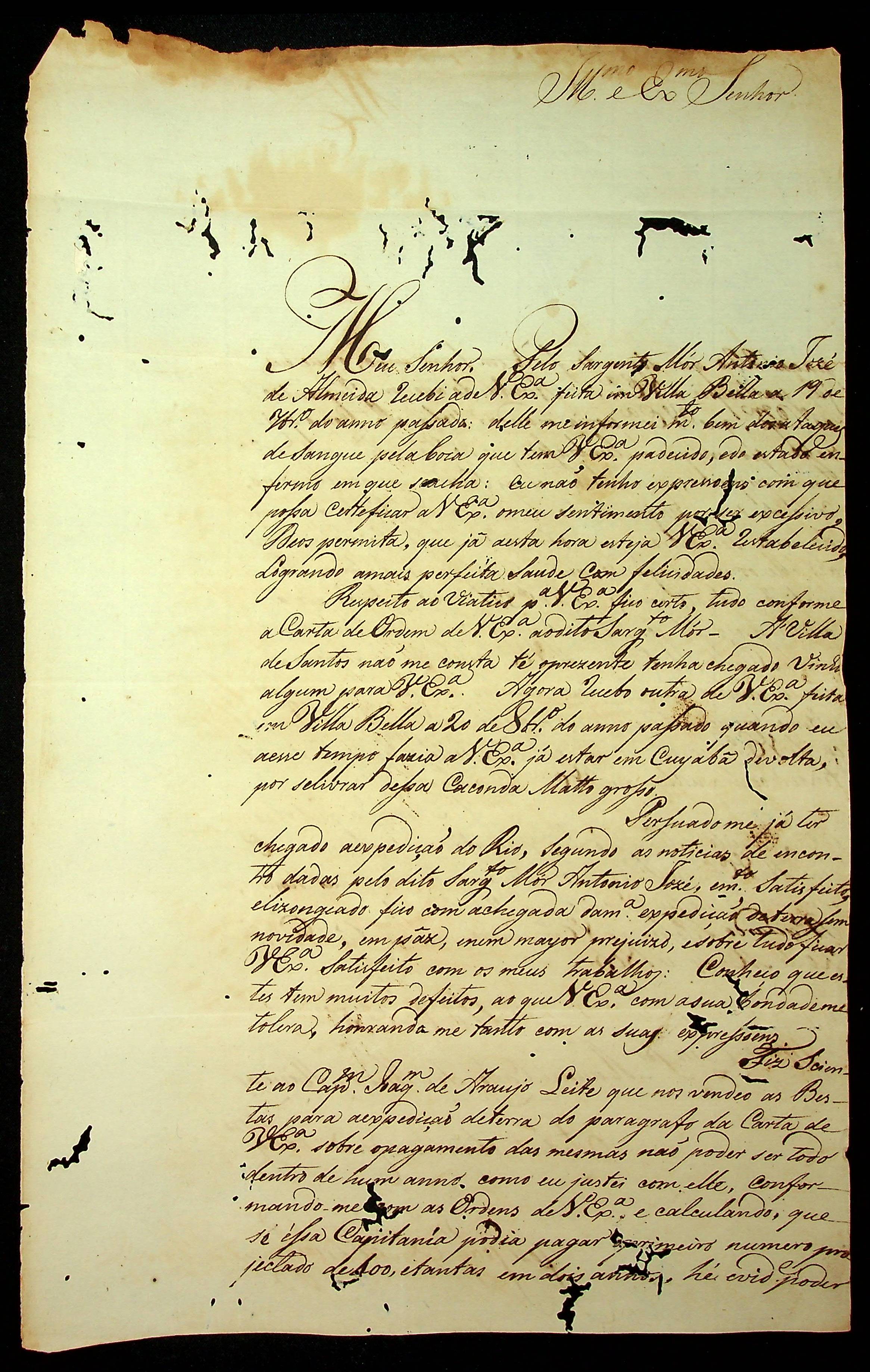 CARTA de José Joaquim Xavier de Toledo ao [Governador e Capitão-General da Capitania de Mato Grosso] Manoel Carlos de Abreu e Menezes.