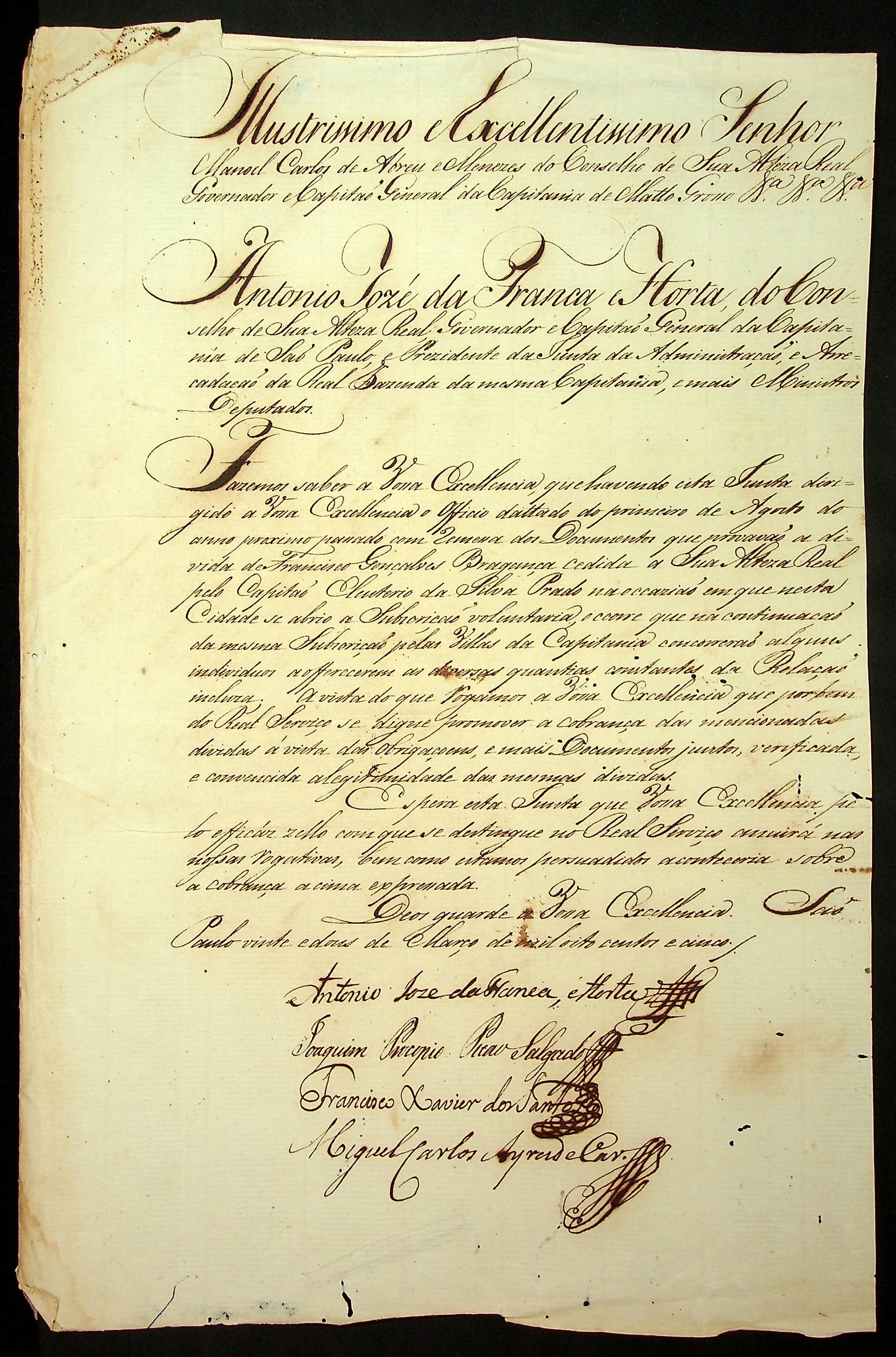 CARTA da Junta da administração e arrecadação da Real Fazenda presidida pelo Governador e Capitão-General da Capitania de São Paulo Antônio José da França e Horta ao Governador e Capitão-General da Capitania de Mato Grosso Manoel Carlos de Abreu e Menezes.