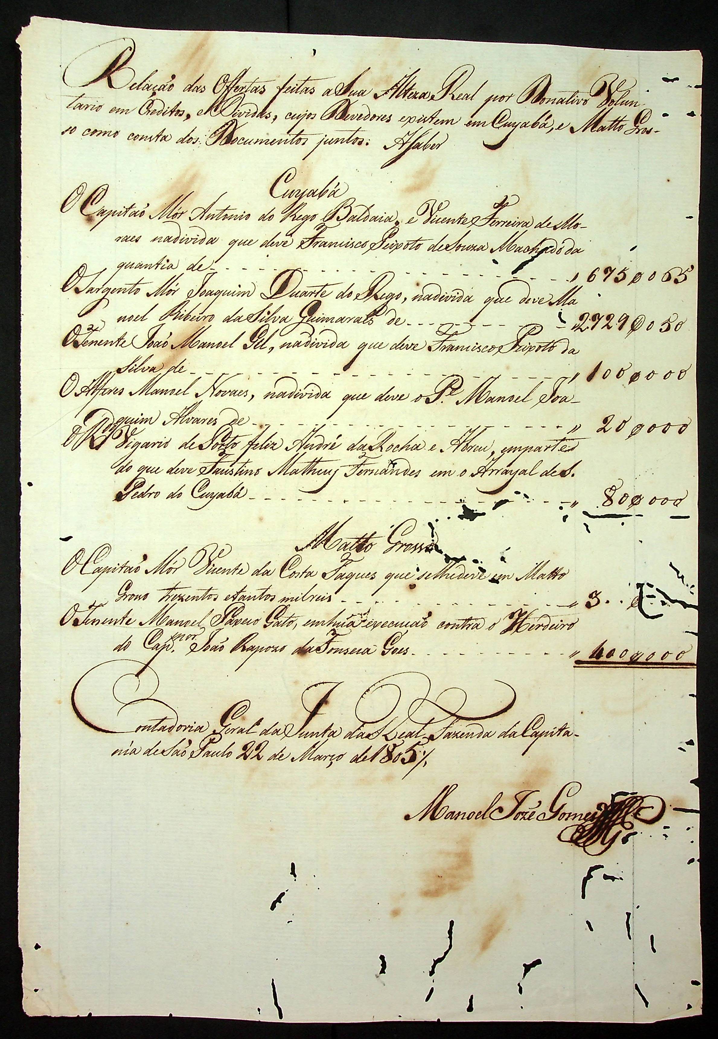 CARTA da Junta da administração e arrecadação da Real Fazenda presidida pelo Governador e Capitão-General da Capitania de São Paulo Antônio José da França e Horta ao Governador e Capitão-General da Capitania de Mato Grosso Manoel Carlos de Abreu e Menezes.