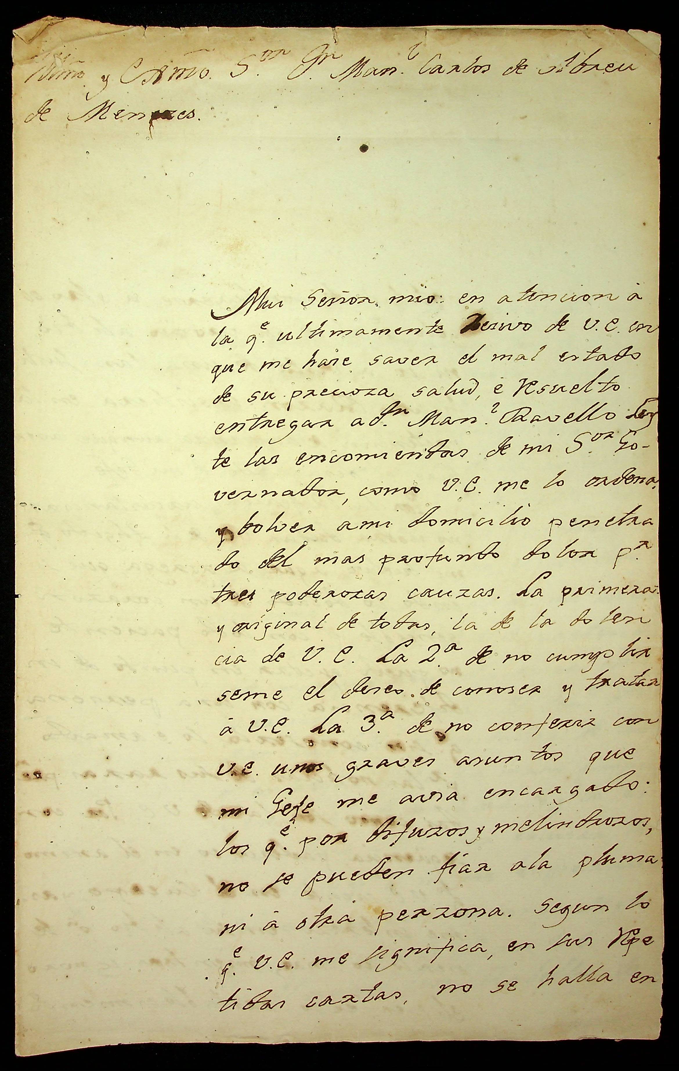 CARTA de Francisco [Xavier] Velasco ao [Governador e Capitão-General da Capitania de Mato Grosso] Manoel Carlos de Abreu e Menezes.