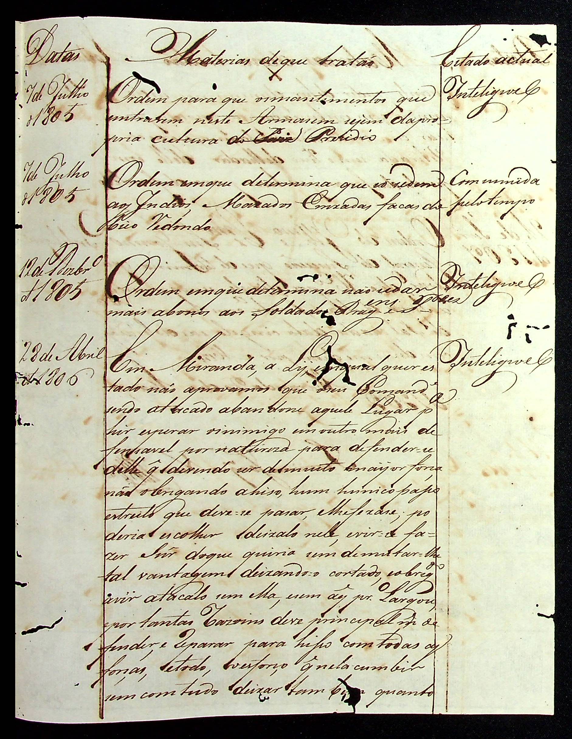 CARTA do Governador e Capitão-General [João Carlos Augusto d´Oeynhausen e Gravemberg] ao Comandante de Miranda Jerônimo Joaquim Nunes.