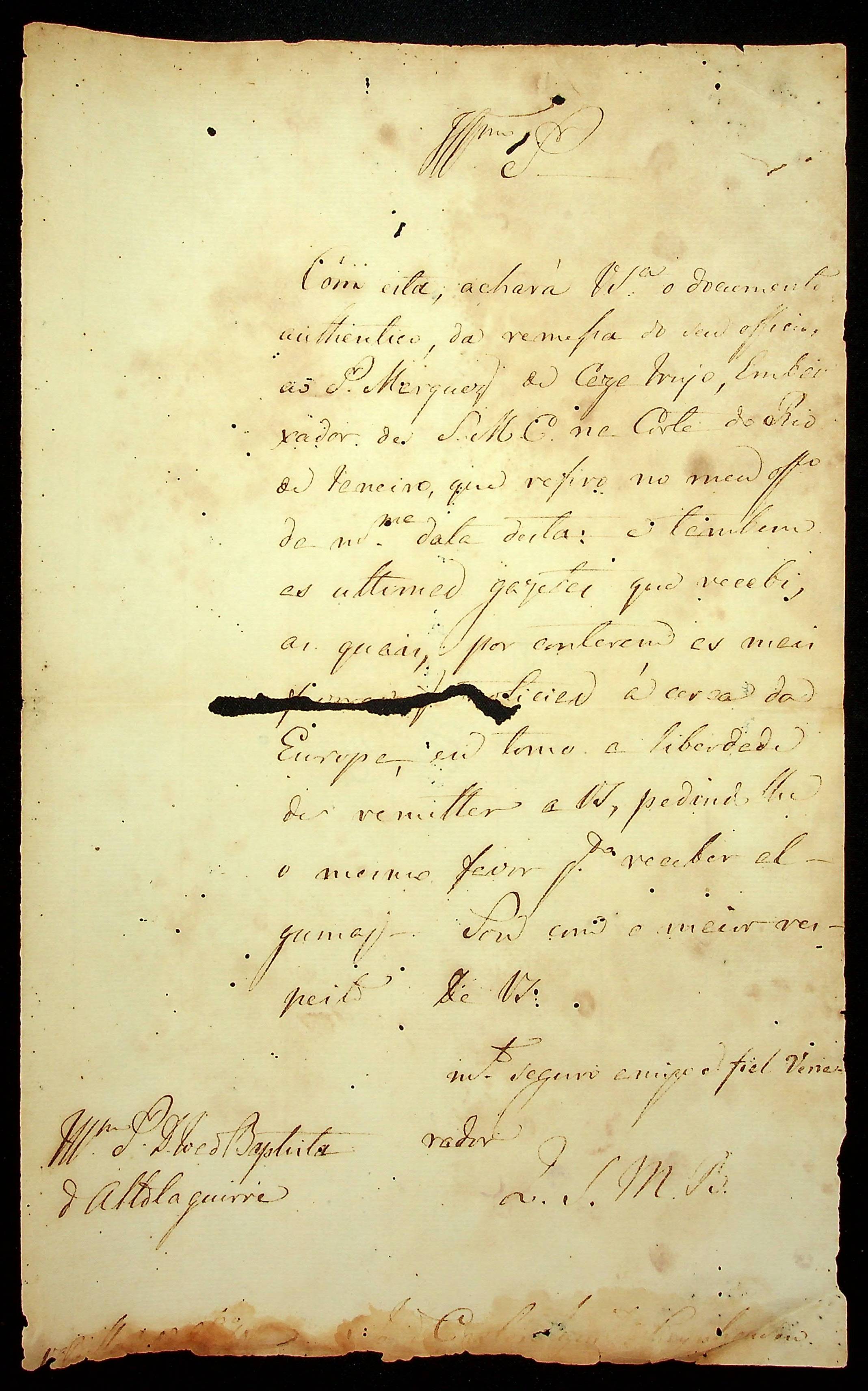 CARTA do [Governador e Capitão-General da Capitania de Mato Grosso] João Carlos d´Oeynhausen e Gravemberg a [..] João Batista [d´Alldlaguirre].