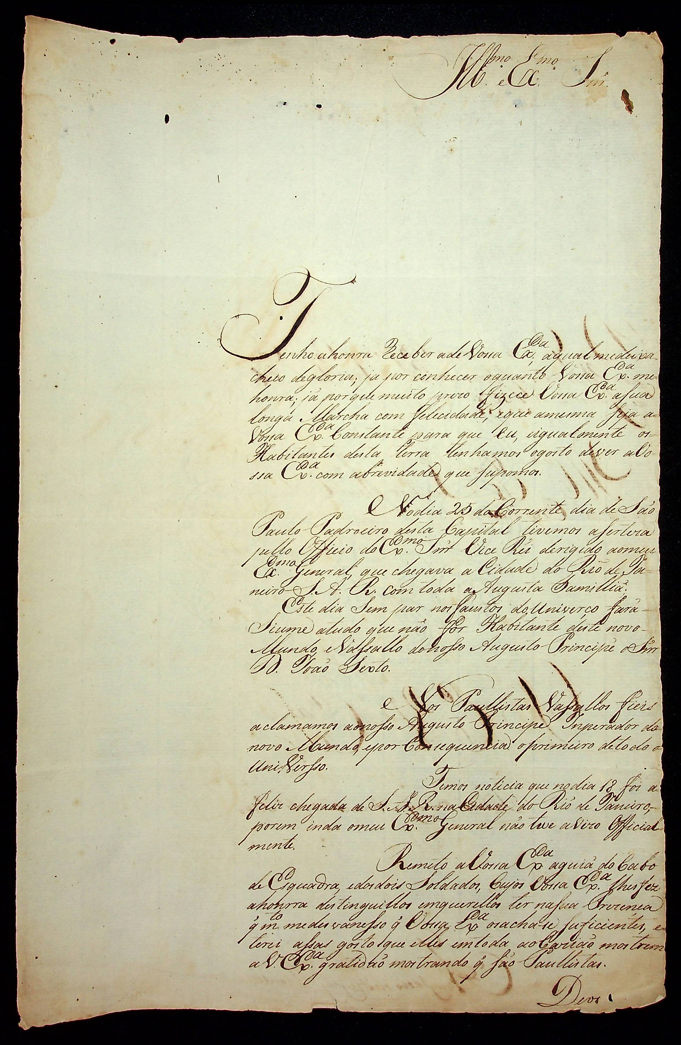 CARTA do [Sargento-mor da Brigada de Infantaria da Legião de Voluntários da Capitania de São Paulo] Anastácio de Freitas Francoso ao [Governador e Capitão-General da Capitania de Mato Grosso] João Carlos Augusto d´ Oeynhausen e Gravemberg.