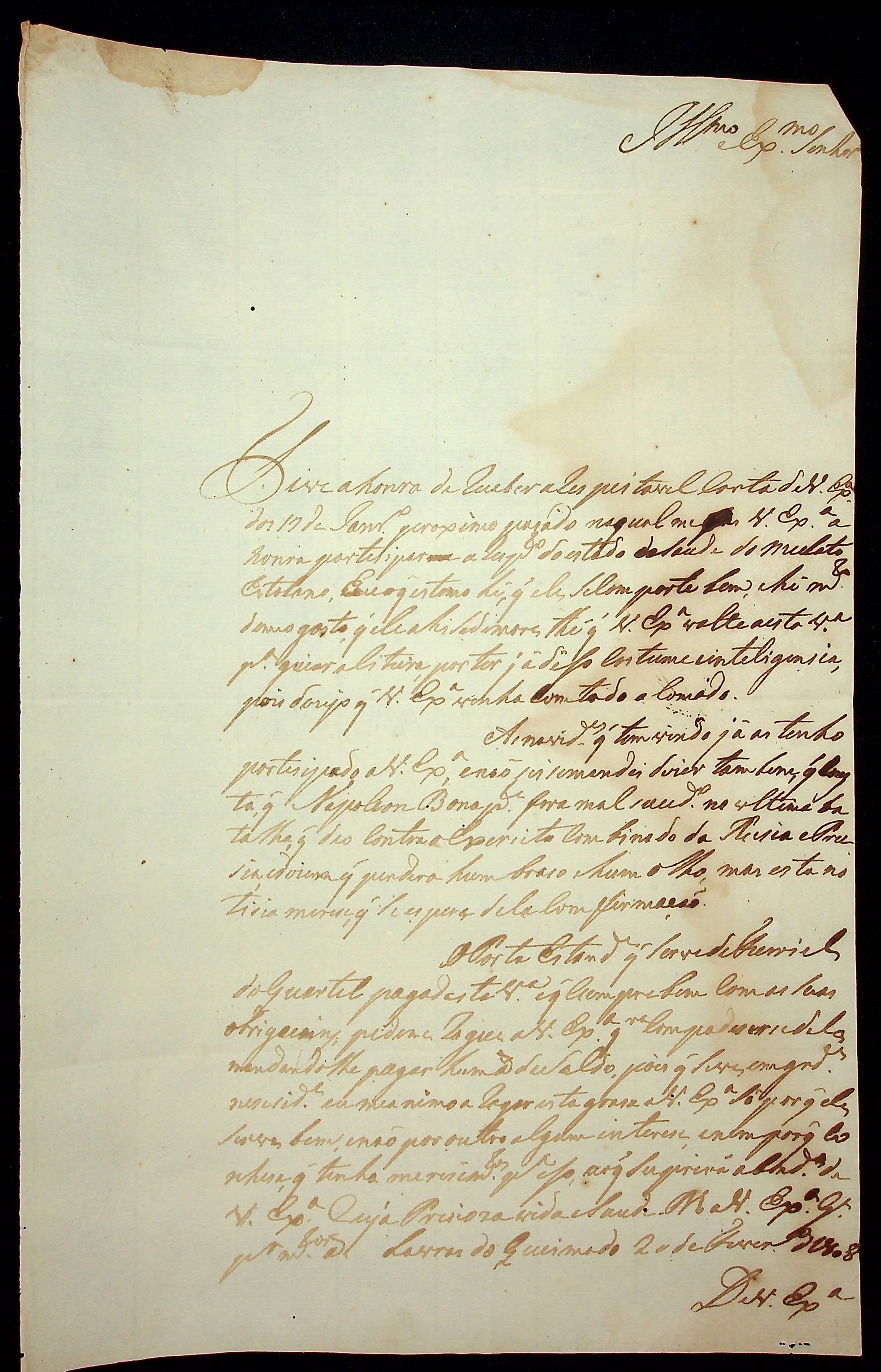 CARTA de [...] ao [Governador e Capitão-General da Capitania de Mato Grosso João Carlos Augusto D’ Oeynhausen e Gravemberg].