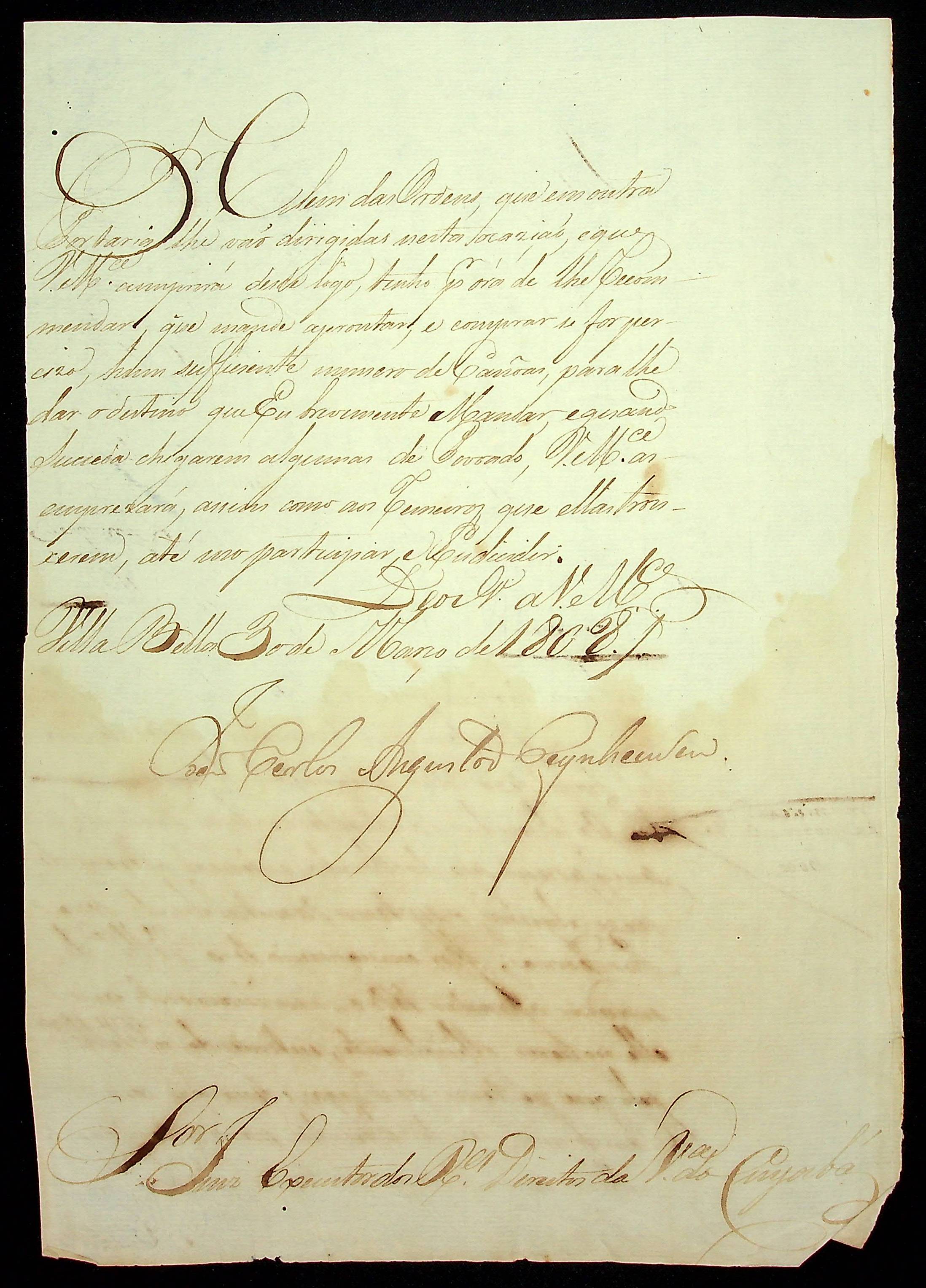 CARTA do [Governador e Capitão-General da Capitania de Mato Grosso] João Carlos Augusto D’Oeynhausen e Gravemberg ao Juiz Executor dos Reais Direitos da Vila do Cuiabá.