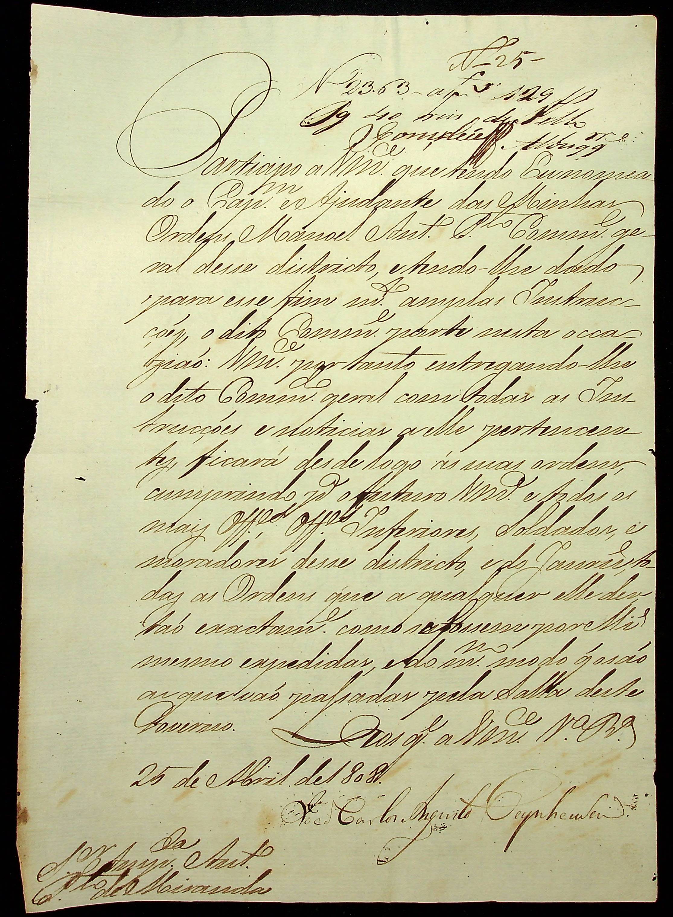 CARTA do [Governador e Capitão-General da Capitania de Mato Grosso] João Carlos Augusto D’Oeynhausen e Gravemberg ao anspeçada Antônio Pinto de Miranda.