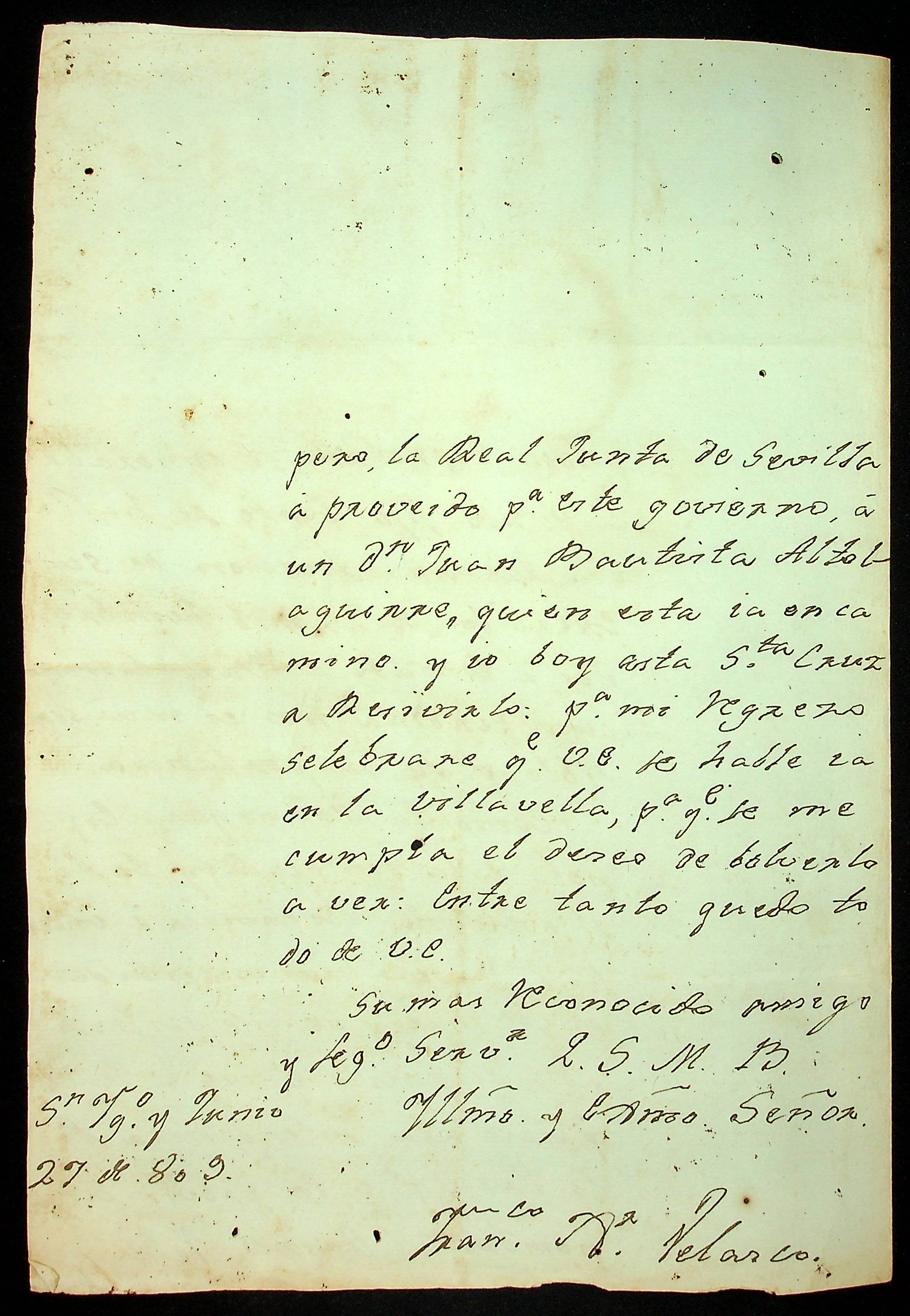 CARTA de [...] Velasco ao [Governador e Capitão-General da Capitania de Mato Grosso] João Carlos Augusto D’ Oeynhausen e Gravemberg.