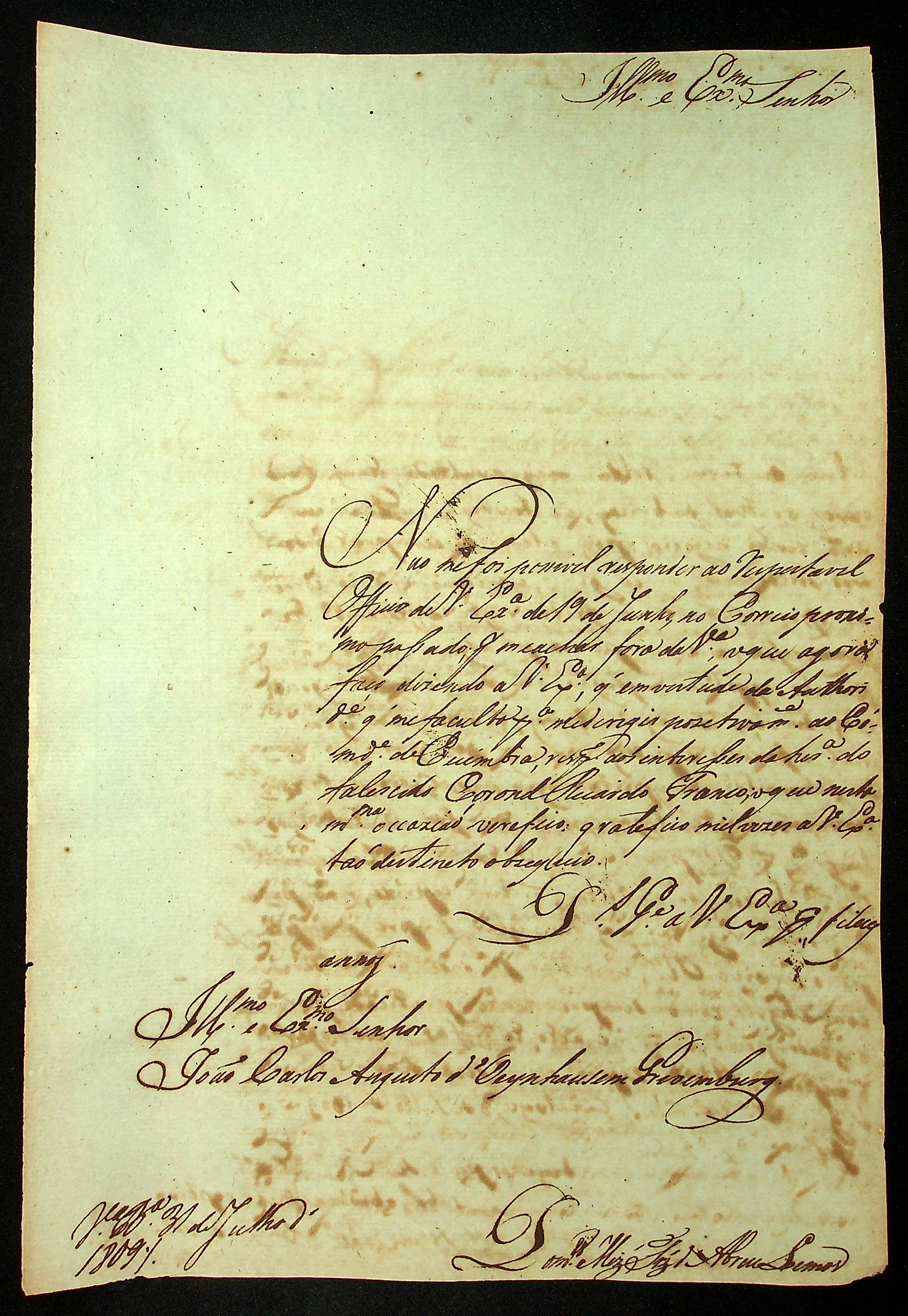 CARTA de Domingos [Martins] Fernandez d'Abreu Lemos ao [Governador e Capitão-General da Capitania de Mato Grosso] João Carlos Augusto D’Oeynhausen e Gravemberg.
