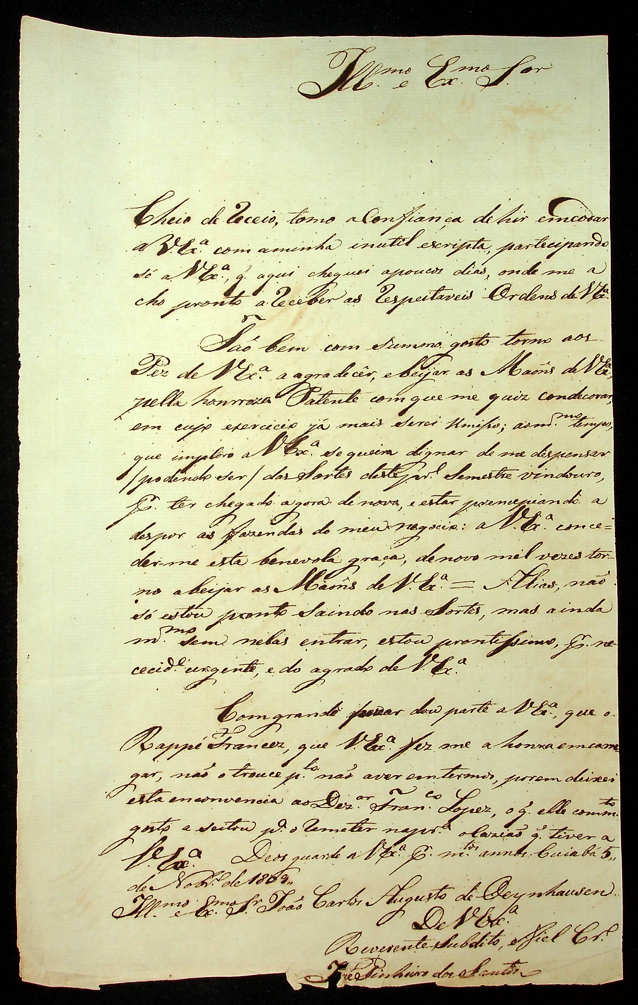 CARTA de José Pinheiro dos Santos ao [Governador e Capitão-General da Capitania de Mato Grosso] João Carlos Augusto D’Oeynhausen e Gravemberg.