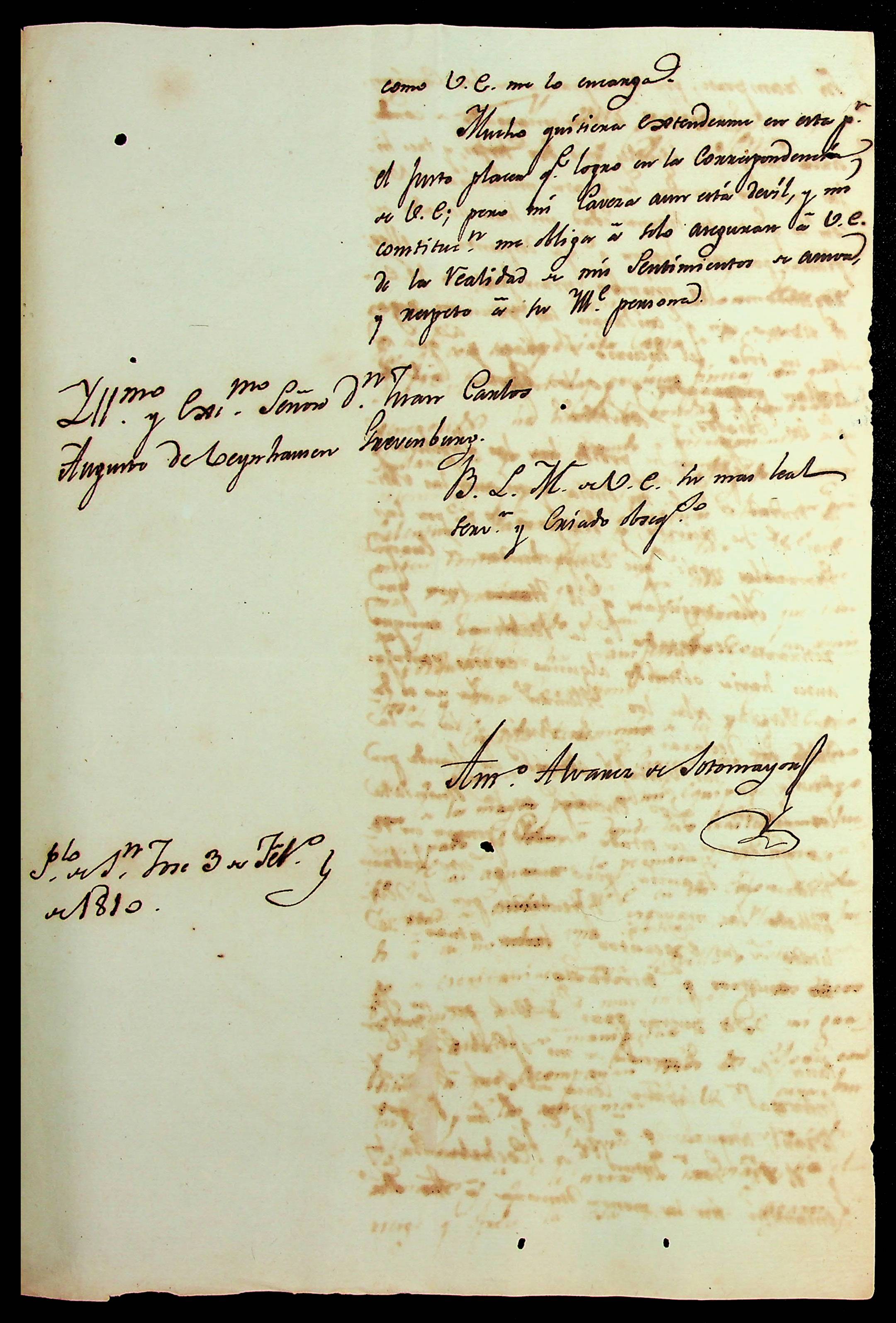 CARTA do [Governador e Comandante General da Província de Chiquitos] Antônio Alvarez de Sotomayoz ao [Governador e Capitão-General da Capitania de Mato Grosso] João Carlos Augusto D’Oeynhausen e Gravemberg.