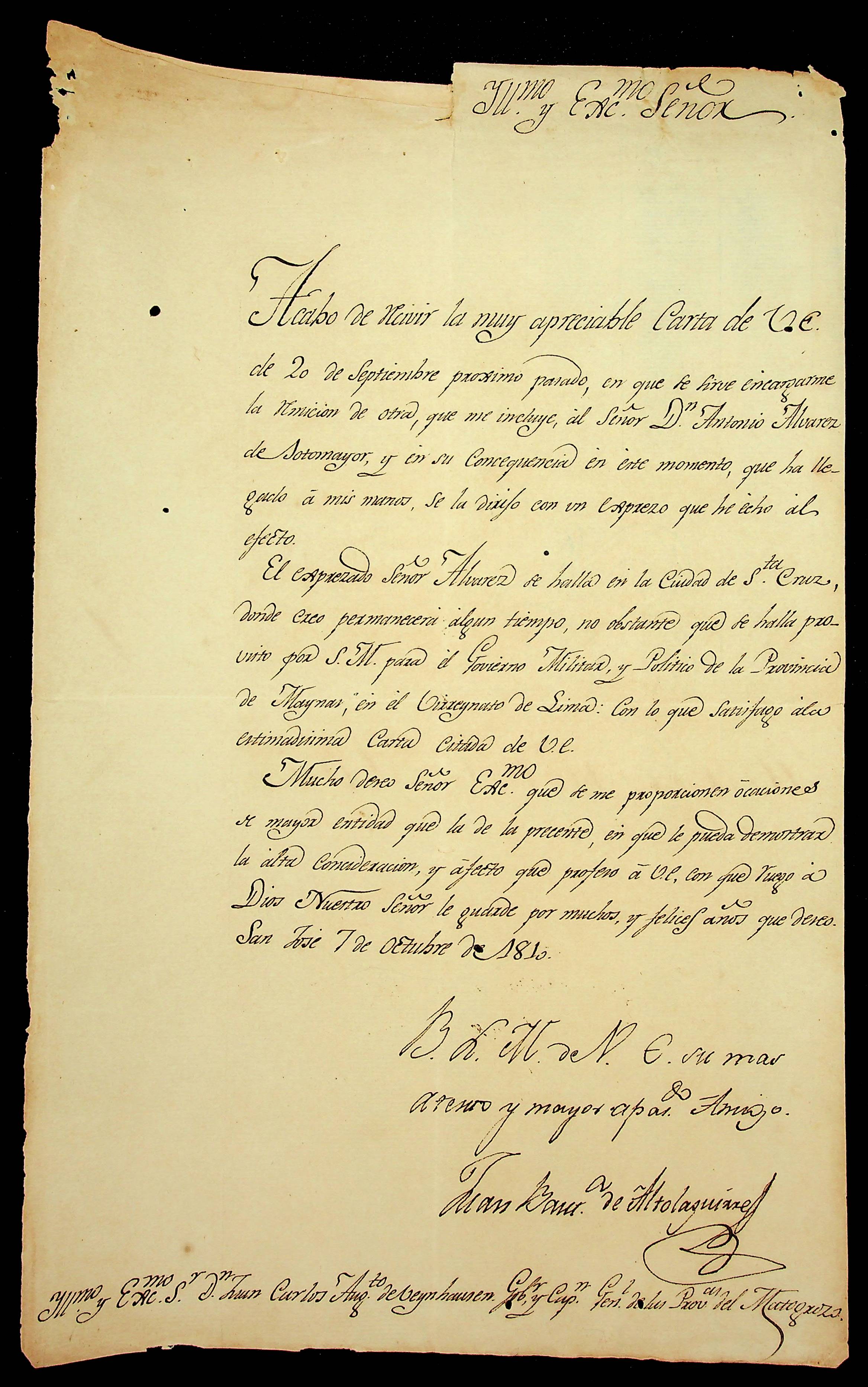CARTA de João [Baut...] de Altoaguinne para o Governador e Capitão-General da Capitania de Mato Grosso João Carlos Augusto de Oyenhausen e Gravemberg.