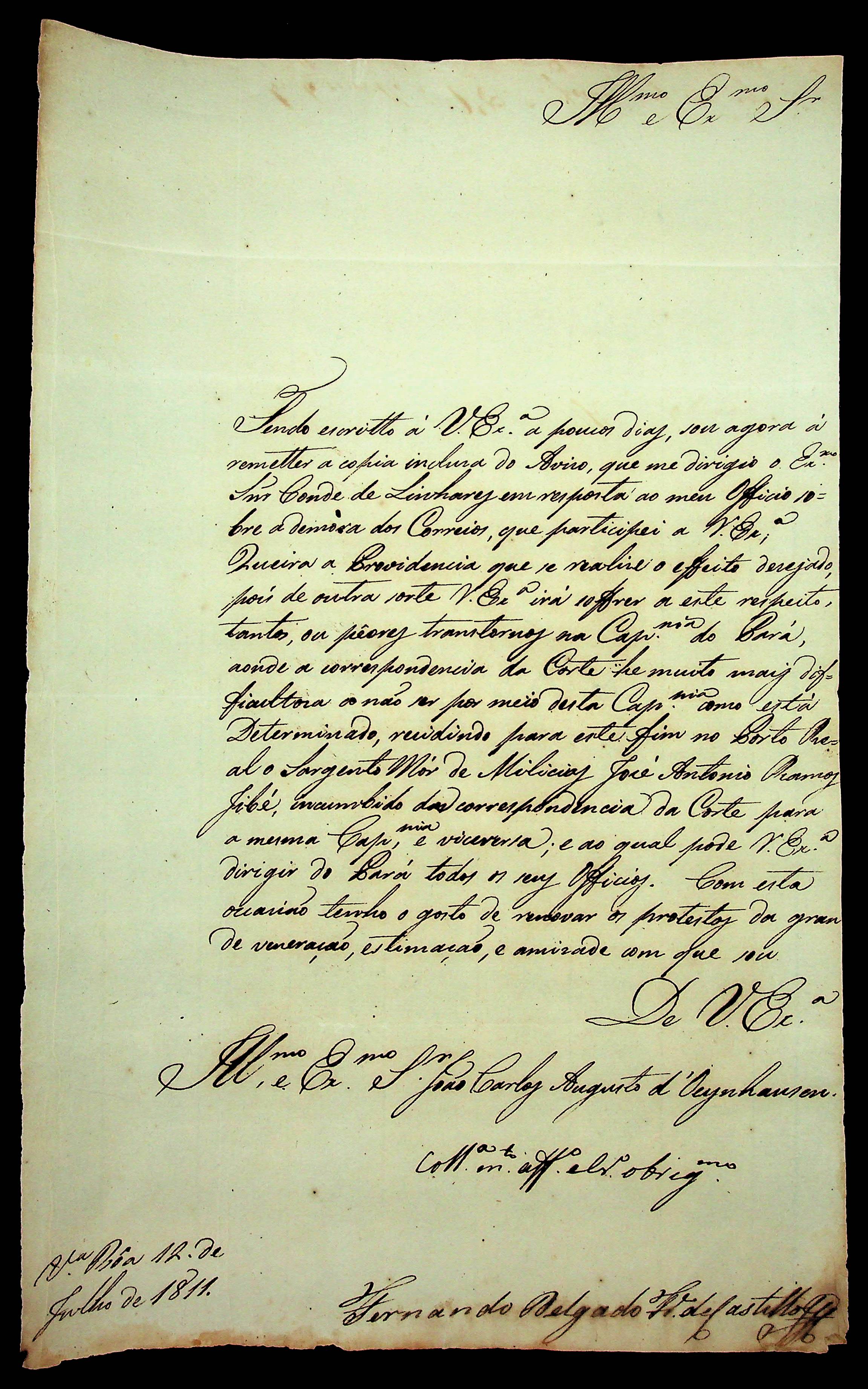 CARTA do [Governador e Capitão-General da Capitania de Goiás] Fernando Delgado Freire de Castilho ao [Governador e Capitão-General da Capitania de Mato Grosso] João Carlos Augusto D’Oeynhausen e Gravemberg.