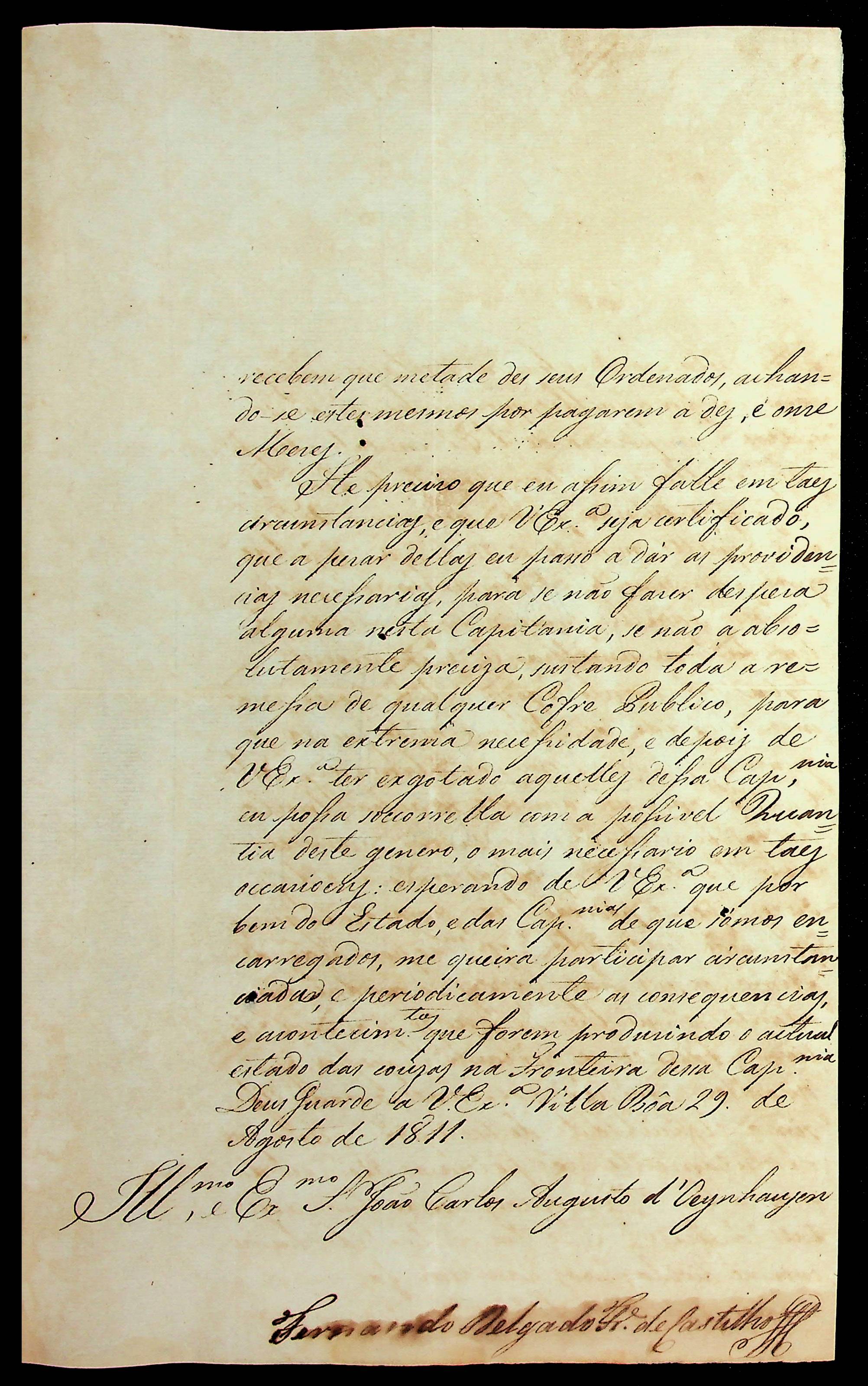 CARTA do [Governador e Capitão-General da Capitania de Goiás] Fernando Delgado Freire de Castilho ao [Governador e Capitão-General da Capitania de Mato Grosso] João Carlos Augusto D’Oeynhausen e Gravemberg.