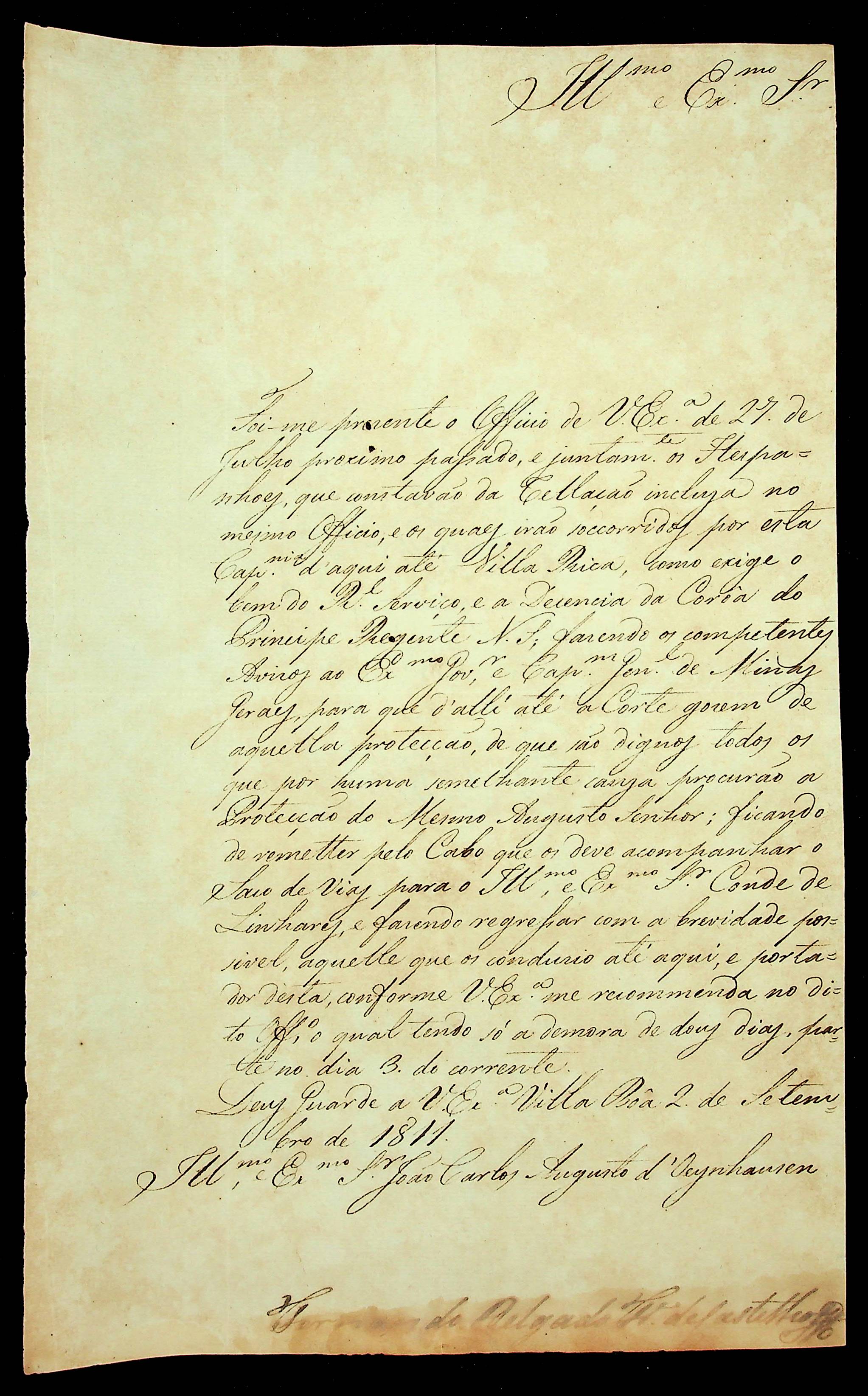 CARTA do [Governador e Capitão-General da Capitania de Goiás] Fernando Delgado Freire de Castilho ao [Governador e Capitão-General da Capitania de Mato Grosso] João Carlos Augusto D’Oeynhausen e Gravemberg.