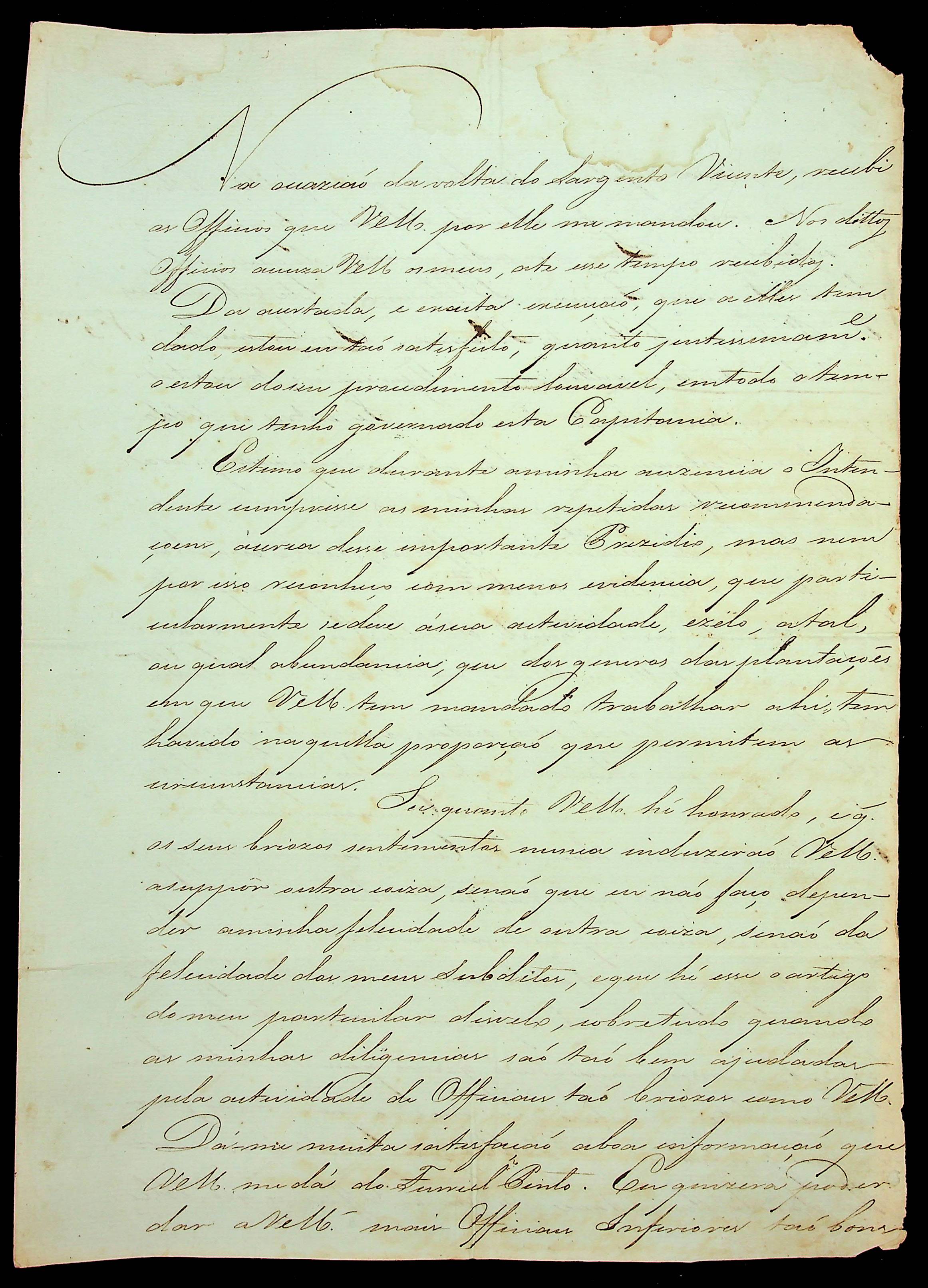 CARTA do [Governador e Capitão-General da Capitania de Mato Grosso] João Carlos Augusto D’Oeynhausen e Gravemberg ao Sargento-Mor Comandante do Forte Príncipe da Beira Manoel Antônio Pinto.