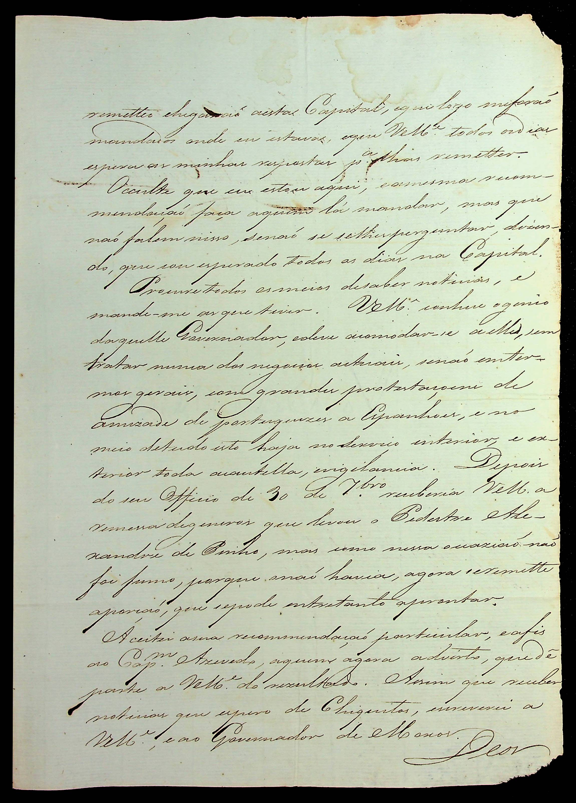 CARTA do [Governador e Capitão-General da Capitania de Mato Grosso] João Carlos Augusto D’Oeynhausen e Gravemberg ao Sargento-Mor Comandante do Forte Príncipe da Beira Manoel Antônio Pinto.
