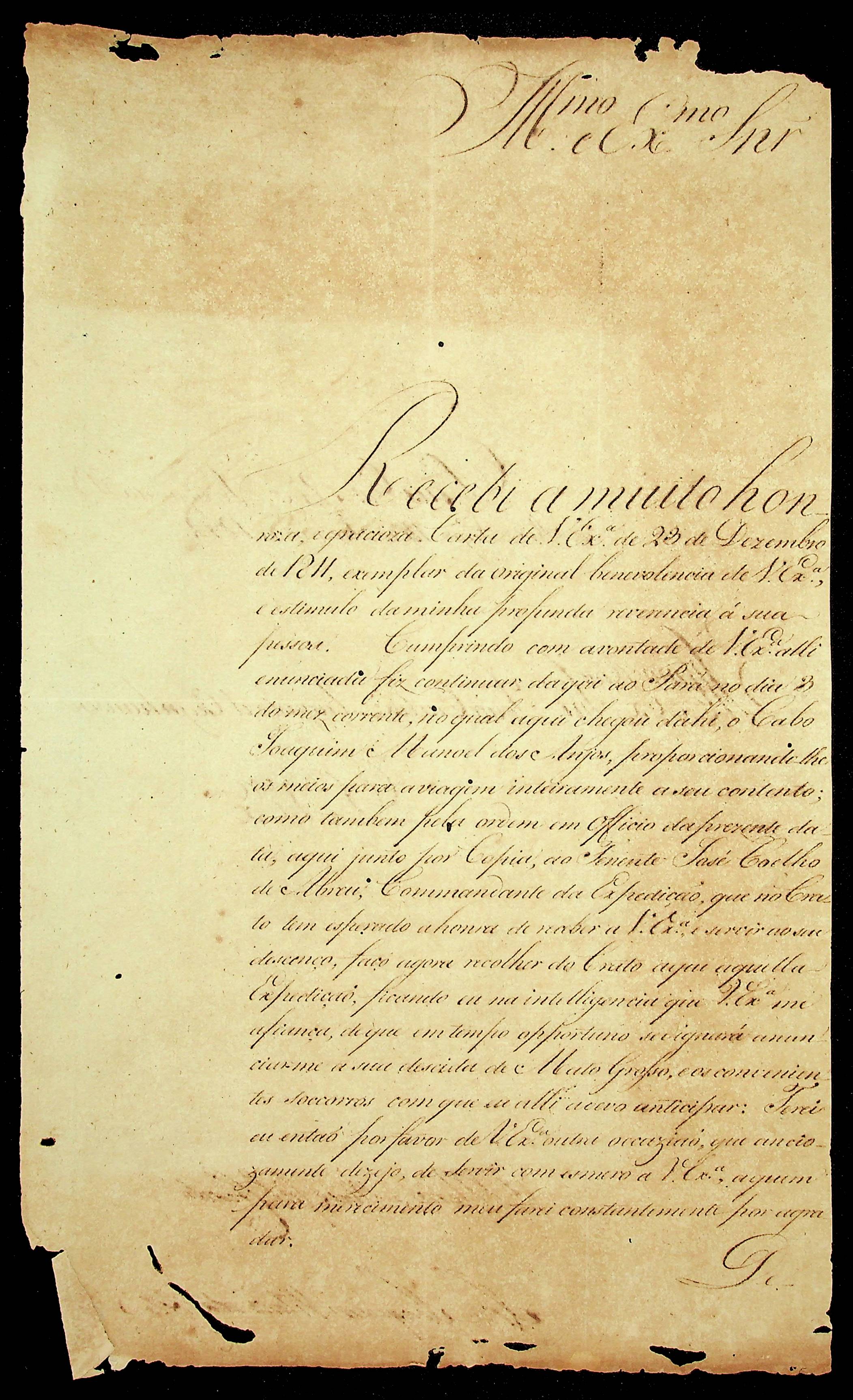CARTA de José Joaquim Vitório da Costa ao [Governador e Capitão-General da Capitania de Mato Grosso] João Carlos Augusto D’Oeynhausen e Gravemberg.