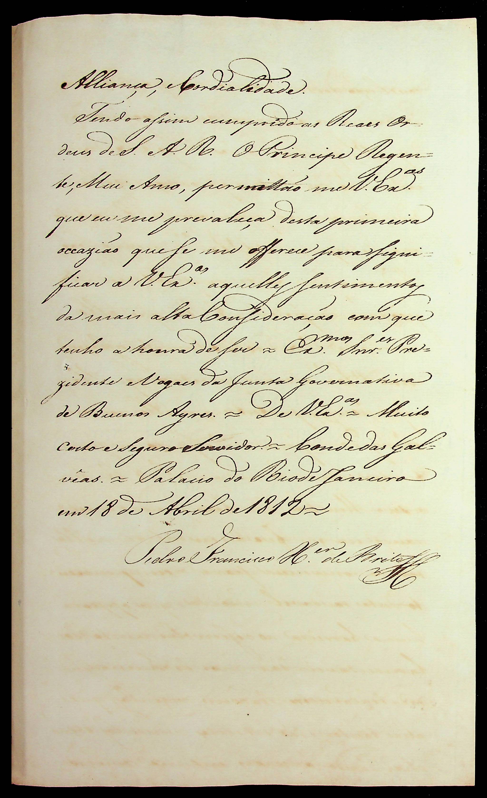 CARTA Conde das [Galveias] ao Presidente e Vogais da Junta Governativa de Buenos Aires.
