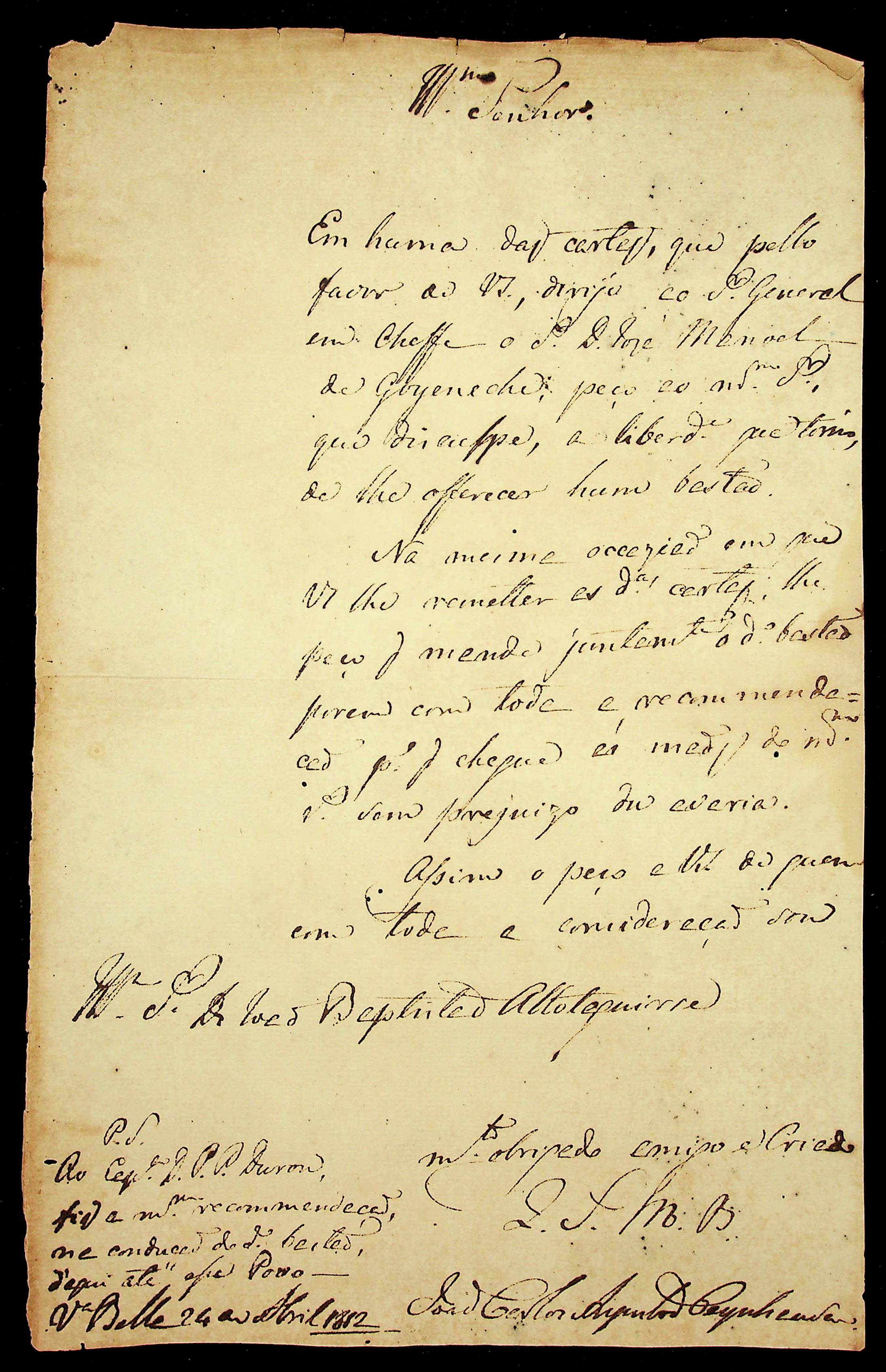 CARTA do Governador e Capitão-General da Capitania de Mato Grosso João Carlos Augusto de Oeynhausen e Granvemberg ao Governador Político e Militar da Província de Chiquitos João Baptista d´Altolaguirre.