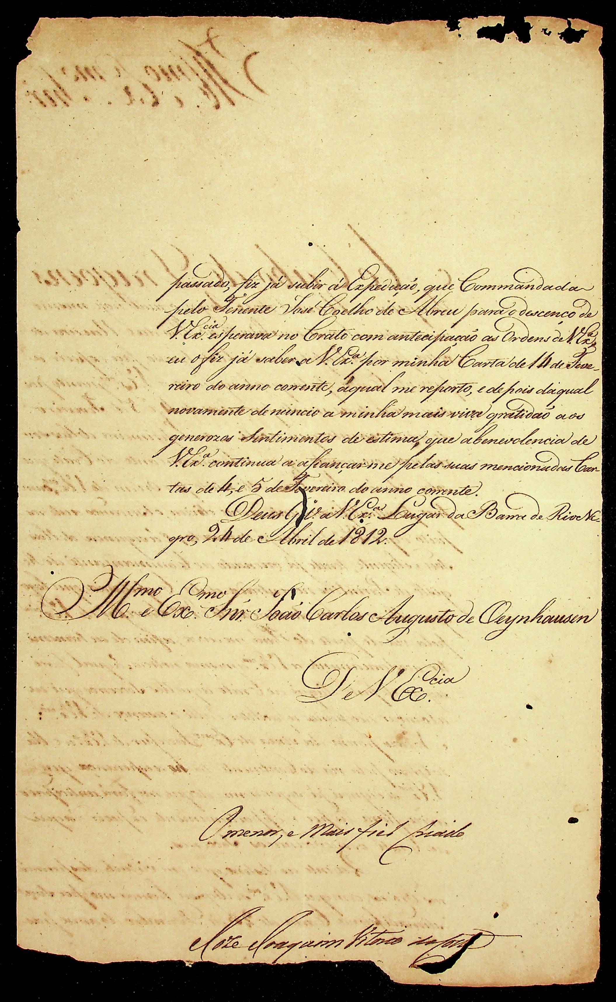 CARTA de José Joaquim Vitório da Costa ao [Governador e Capitão-General da Capitania de Mato Grosso] João Carlos Augusto D’Oeynhausen e Gravemberg.
