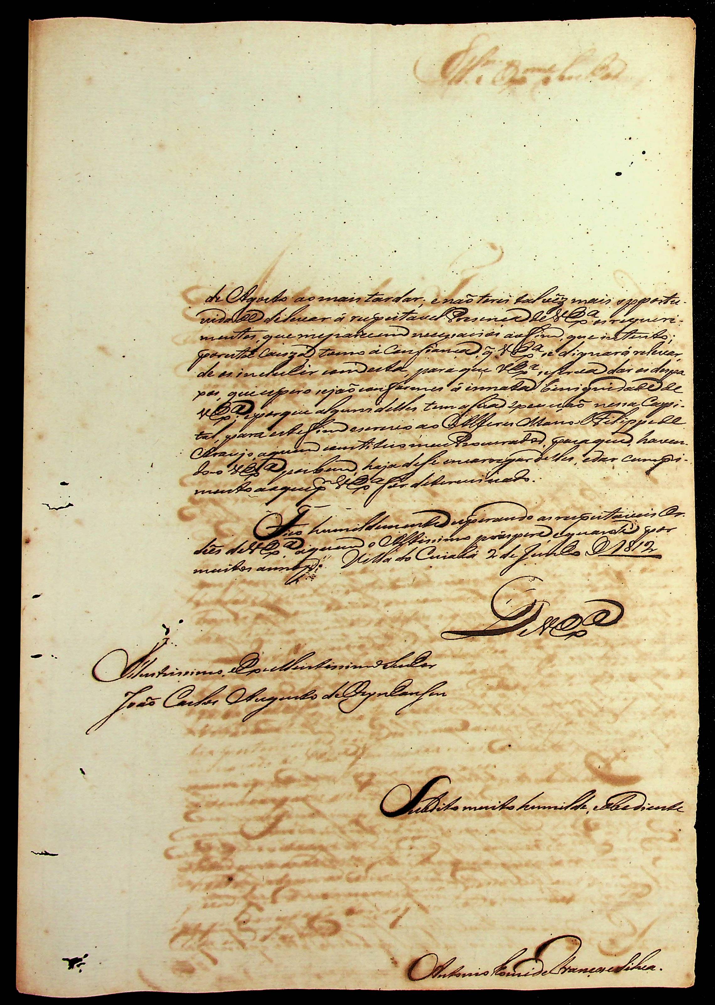 CARTA de Antônio [...] França e Silva ao [Governador e Capitão-General da Capitania de Mato Grosso] João Carlos Augusto D’Oeynhausen e Gravemberg.