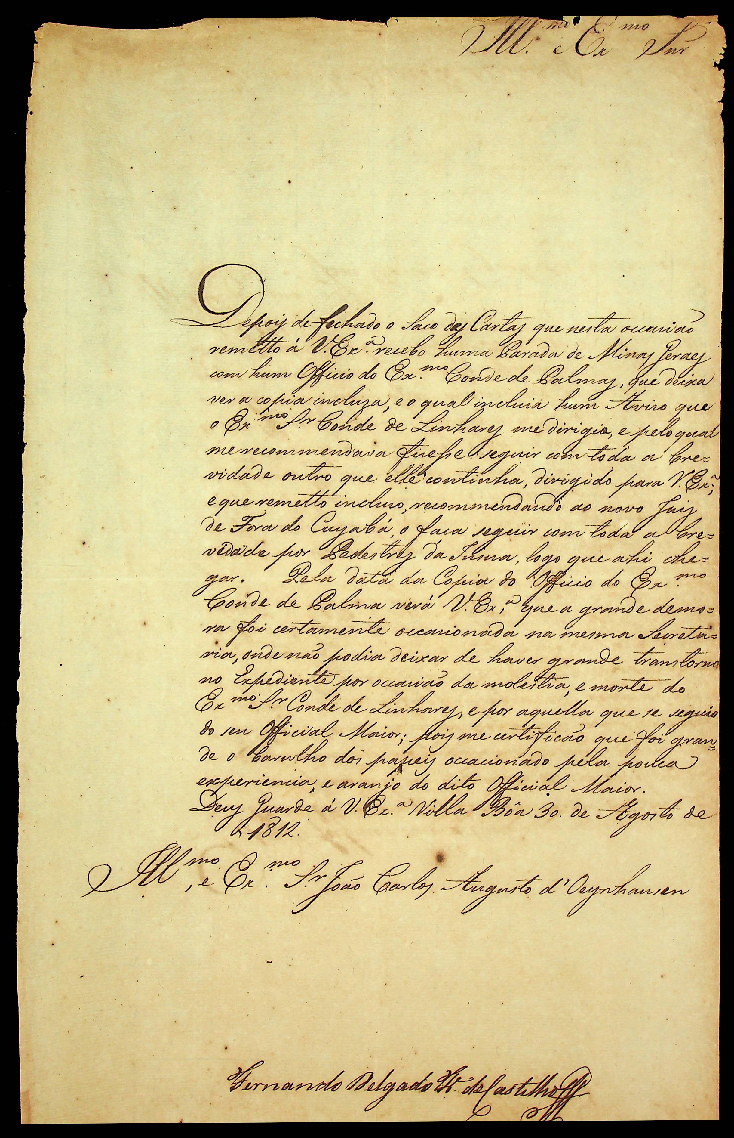 CARTA do [Governador e Capitão-General da Capitania de Goiás] Fernando Delgado Freire de Castilho ao [Governador e Capitão-General da Capitania de Mato Grosso] João Carlos Augusto D’Oeynhausen e Gravemberg.