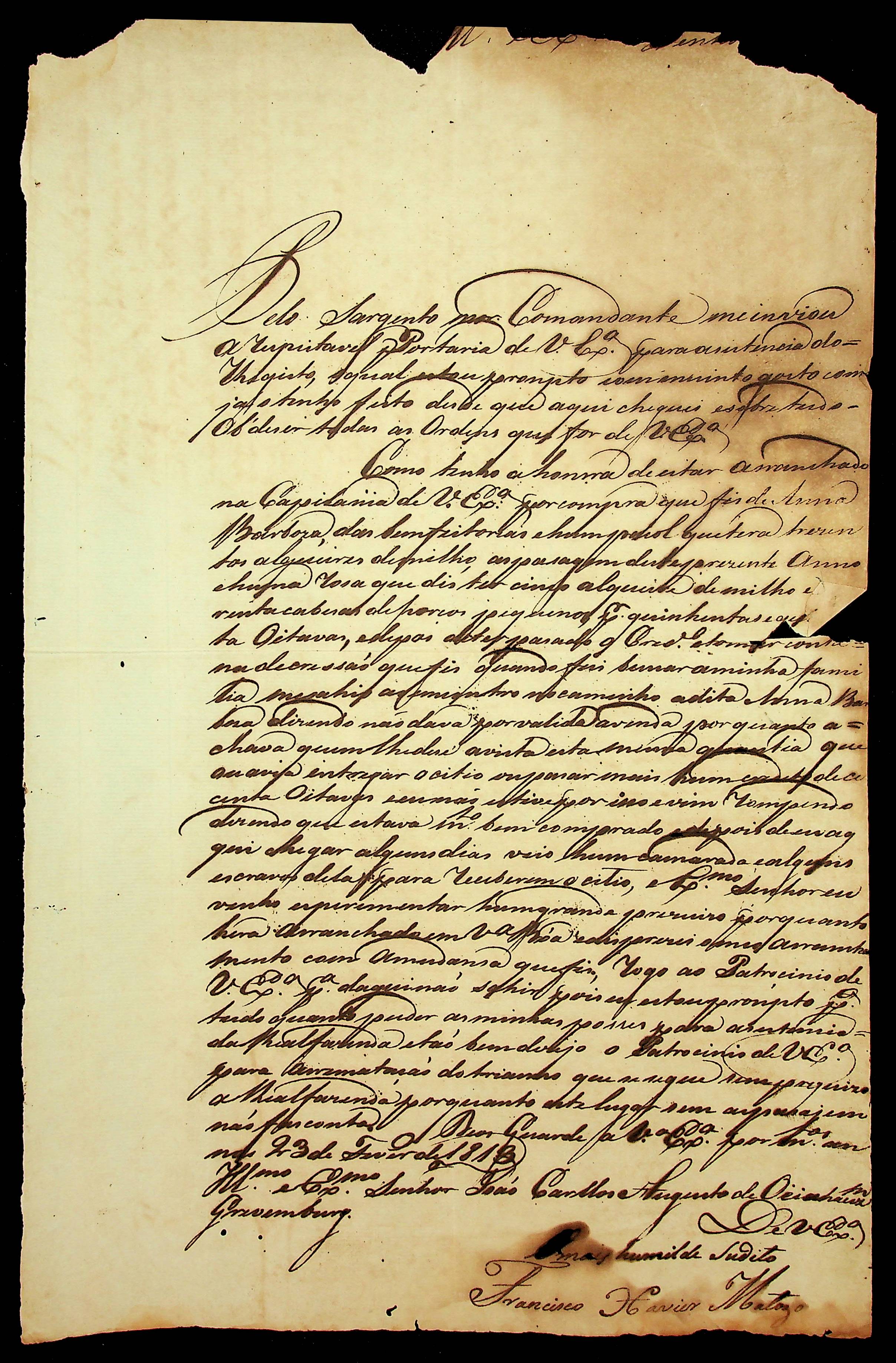 CARTA de Francisco Xavier Matozo ao [Governador e Capitão-General da Capitania de Mato Grosso] João Carlos Augusto D’Oeynhausen e Gravemberg.