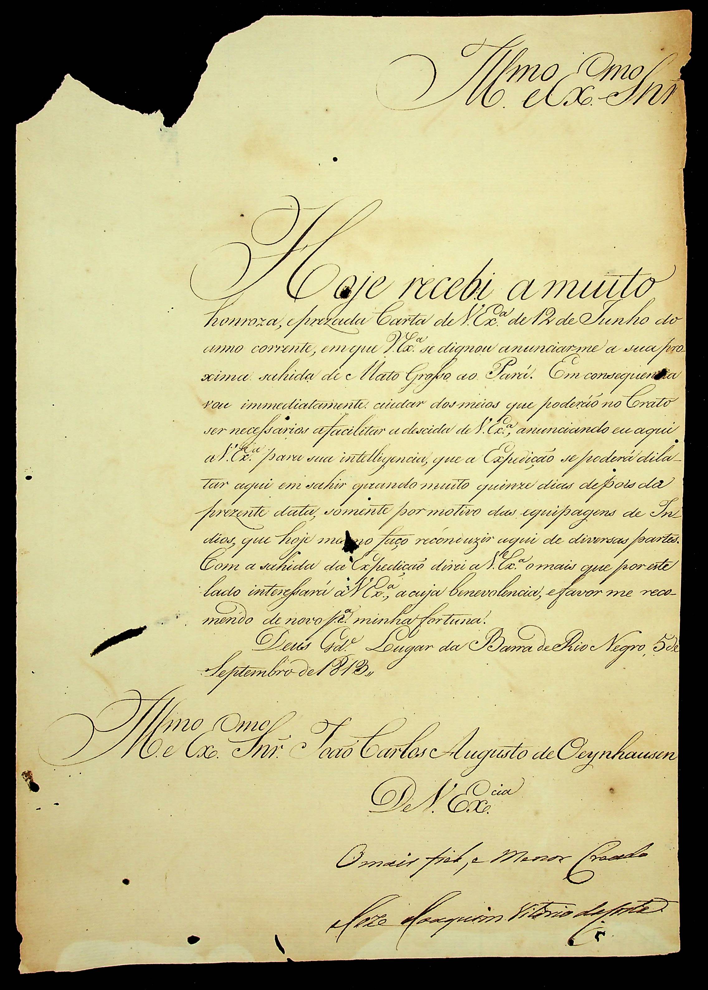CARTA de José Joaquim Vitório da Costa ao [Governador e Capitão-General da Capitania de Mato Grosso] João Carlos Augusto D’Oeynhausen e Gravemberg.
