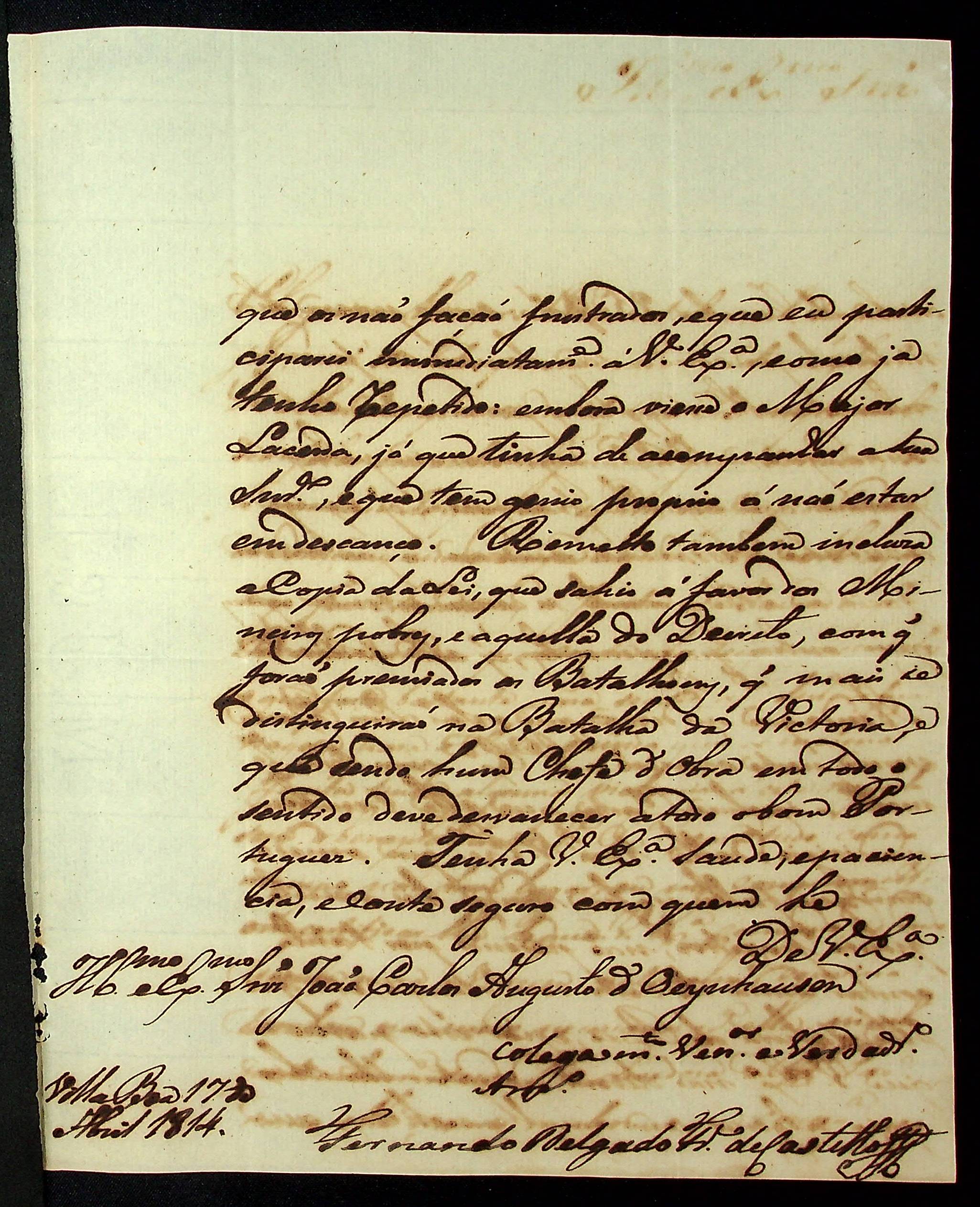 CARTA do [Governador e Capitão-General da Capitania de Goiás] Fernando Delgado Freire de Castilho ao [Governador e Capitão-General da Capitania de Mato Grosso] João Carlos Augusto D’Oeynhausen e Gravemberg.