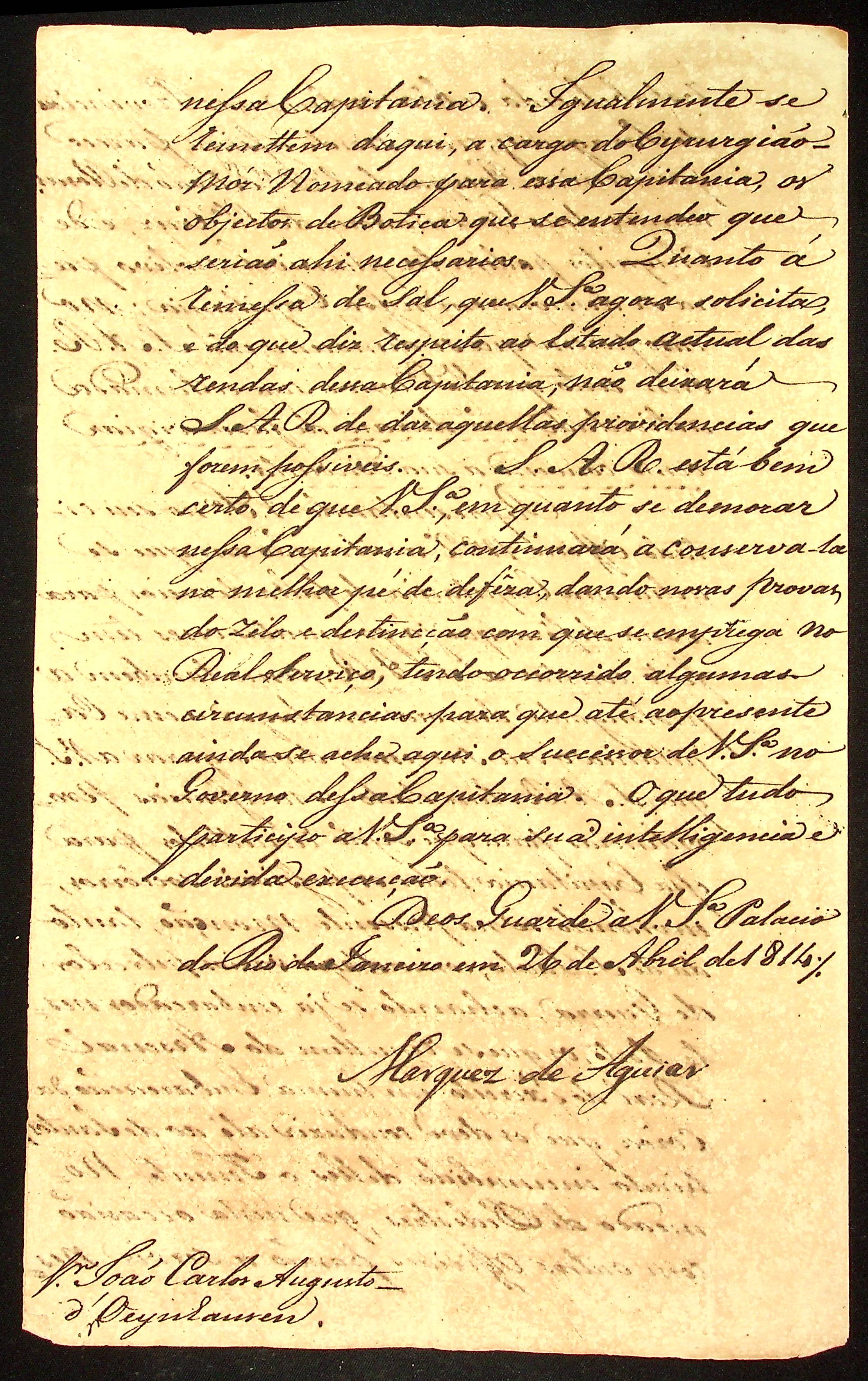 CARTA do Marques de Aguiar ao [Governador e Capitão-General da Capitania de Mato Grosso] João Carlos Augusto D’Oeynhausen e Gravemberg.