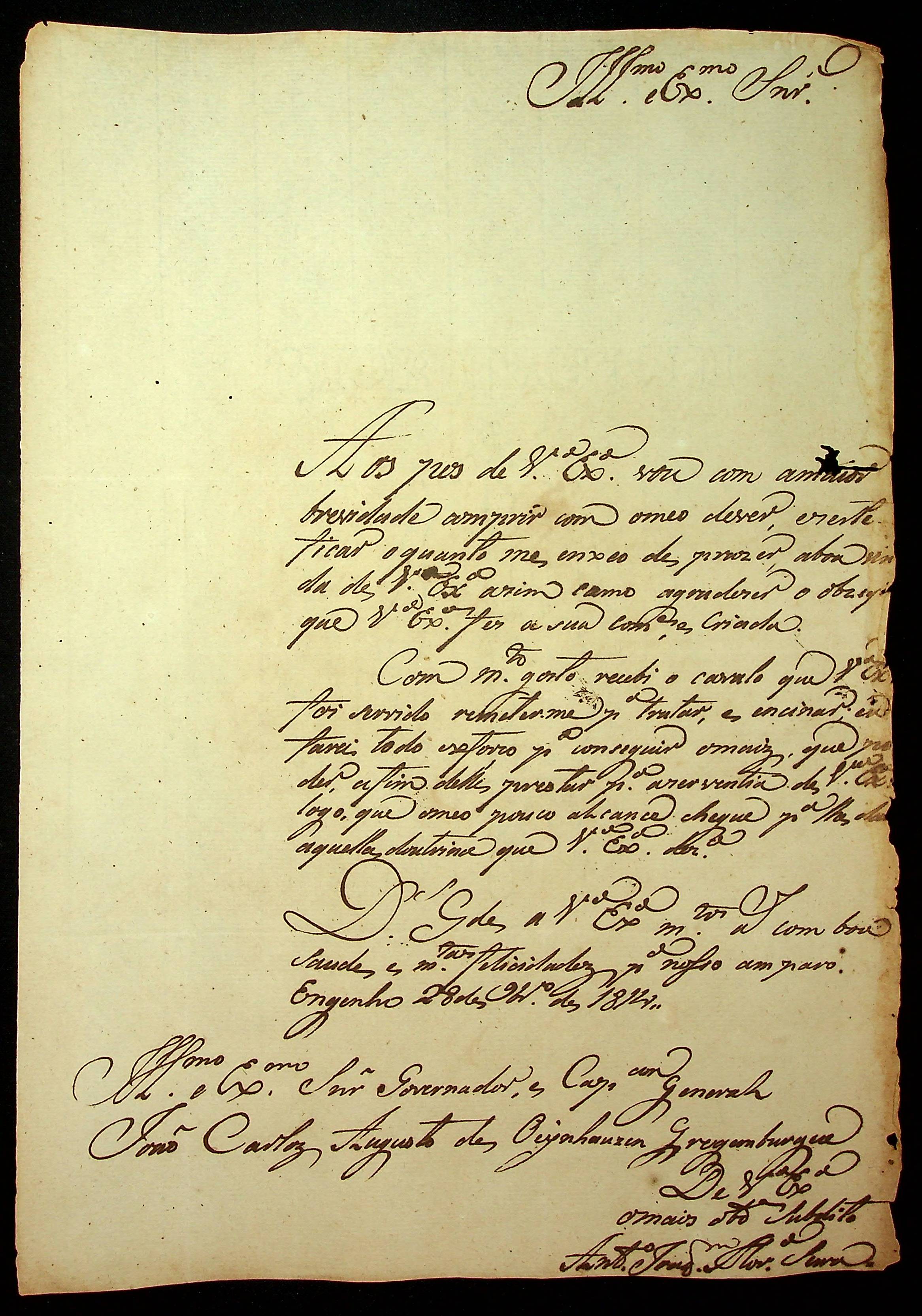 CARTA de Antônio Joaquim [...] Serra ao [Governador e Capitão-General da Capitania de Mato Grosso] João Carlos Augusto D’Oeynhausen e Gravemberg.