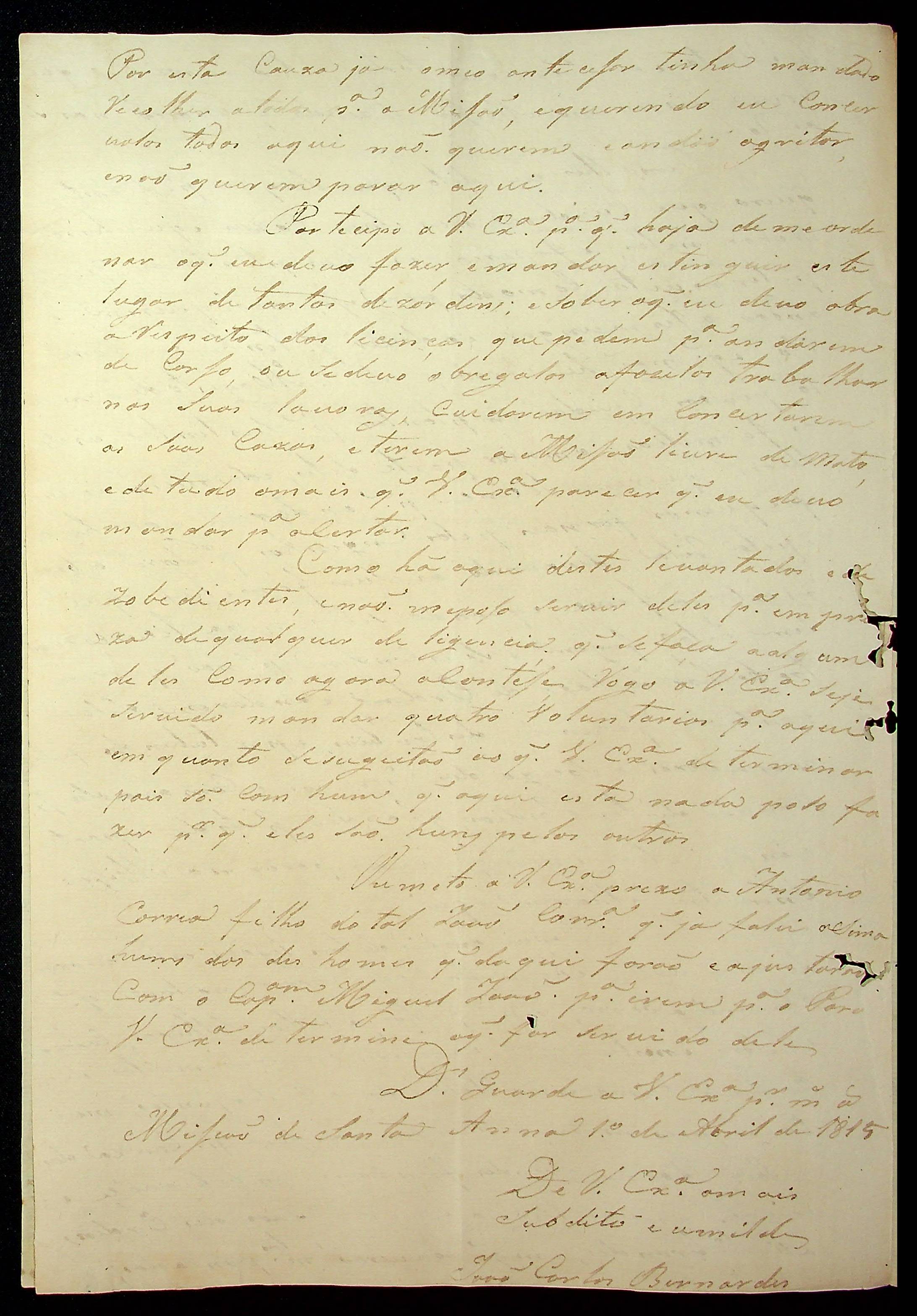 CARTA de João Carlos Bernades ao [Governador e Capitão-General da Capitania de Mato Grosso João Carlos Augusto D´Oeynhausen e Gravemberg].