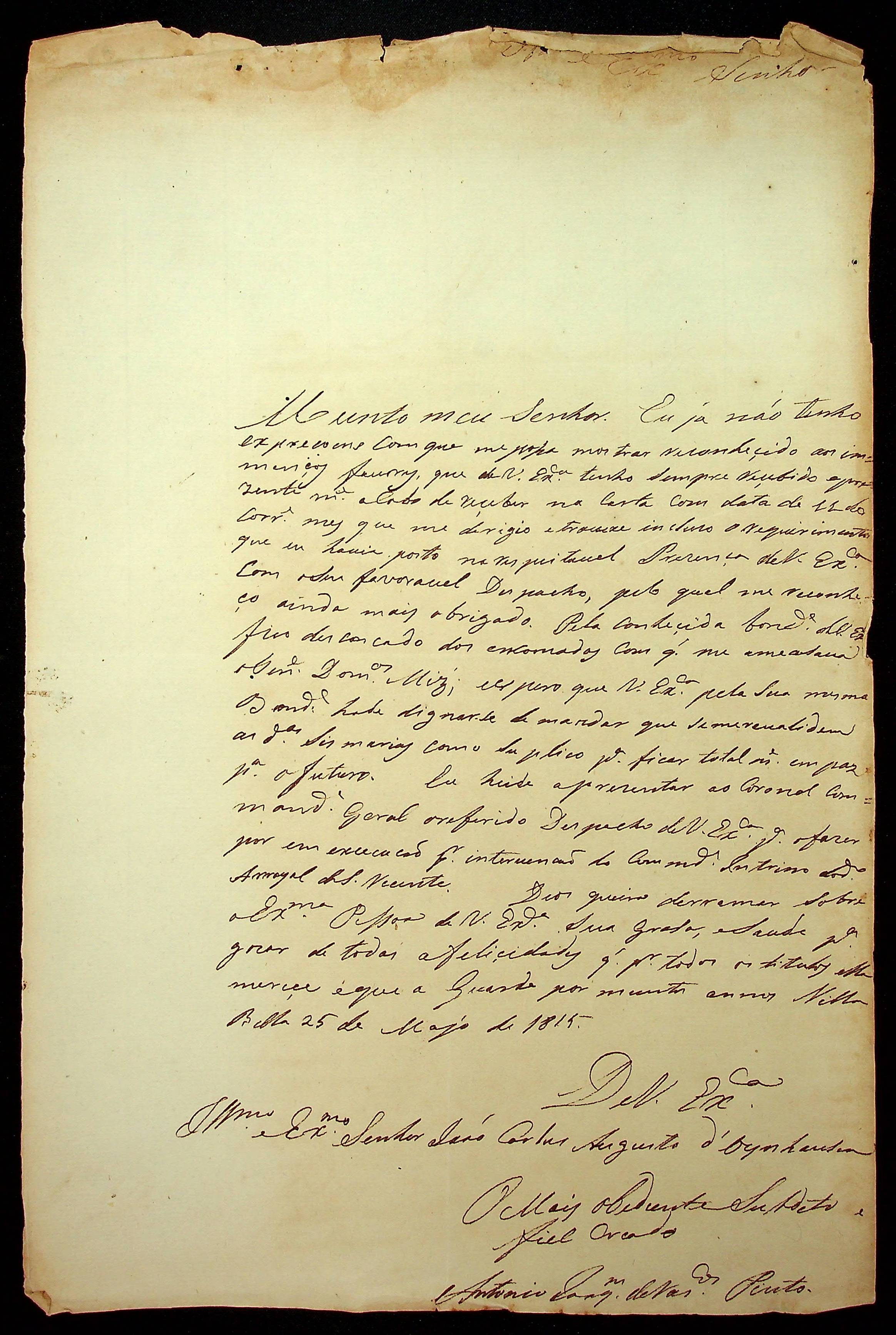 CARTA de Antônio Joaquim de Vasconcelos Pinto ao [Governador e Capitão-General da Capitania de Mato Grosso João Carlos Augusto D´Oeynhausen e Gravemberg].
