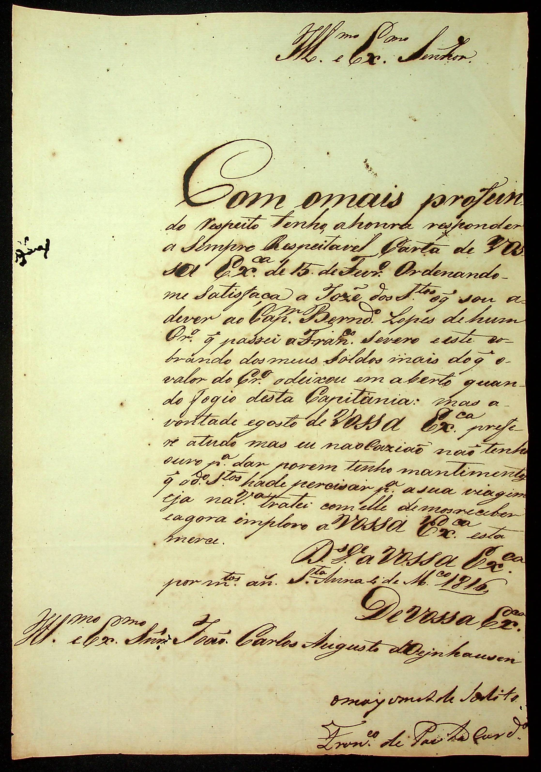 CARTA de Francisco de Paula Cordeiro ao [Governador e Capitão-General da Capitania de Mato Grosso] João Carlos Augusto D’Oeynhausen e Gravemberg.