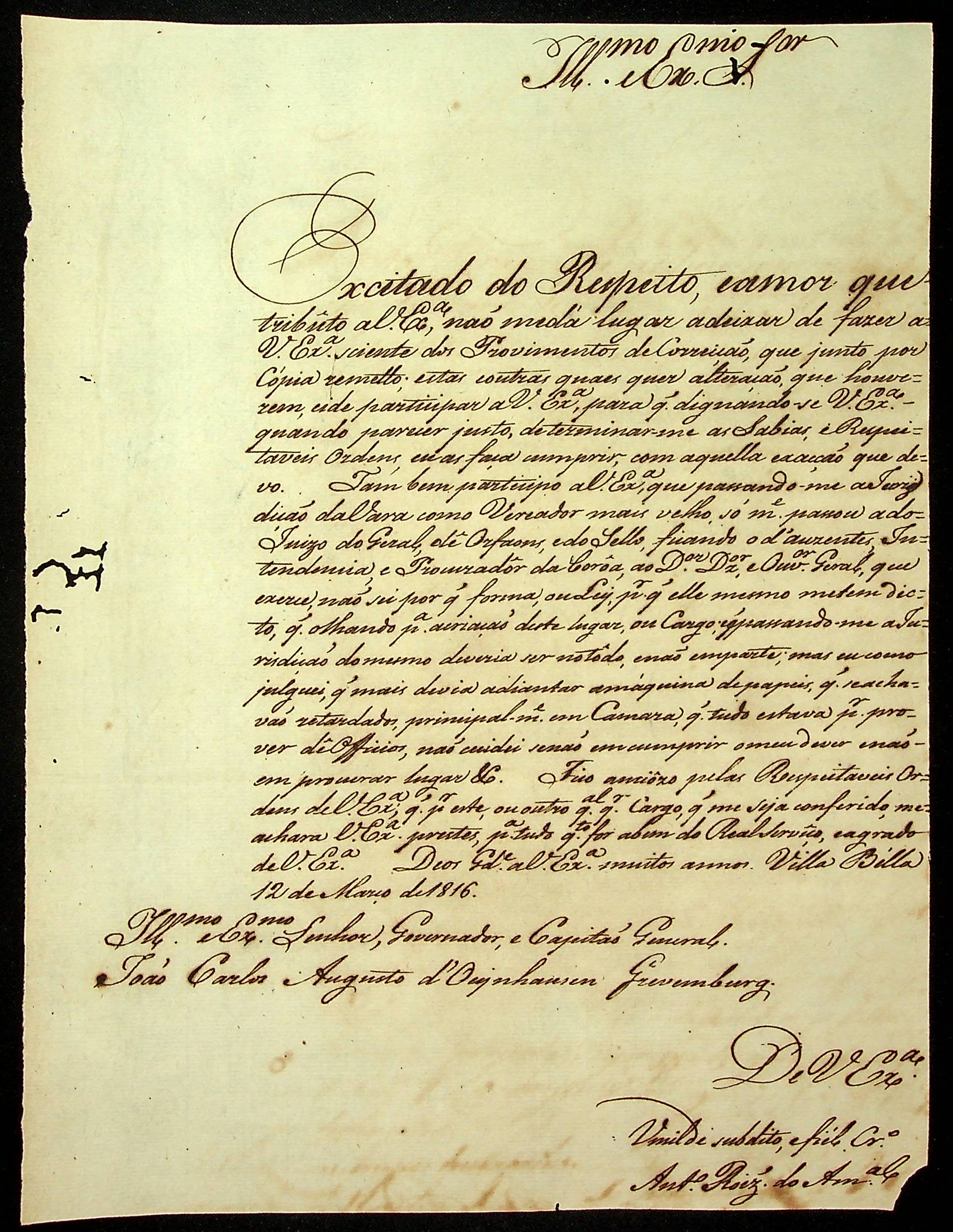 CARTA de Antônio Rodrigues do Amaral ao [Governador e Capitão-General da Capitania de Mato Grosso] João Carlos Augusto D’Oeynhausen e Gravemberg.