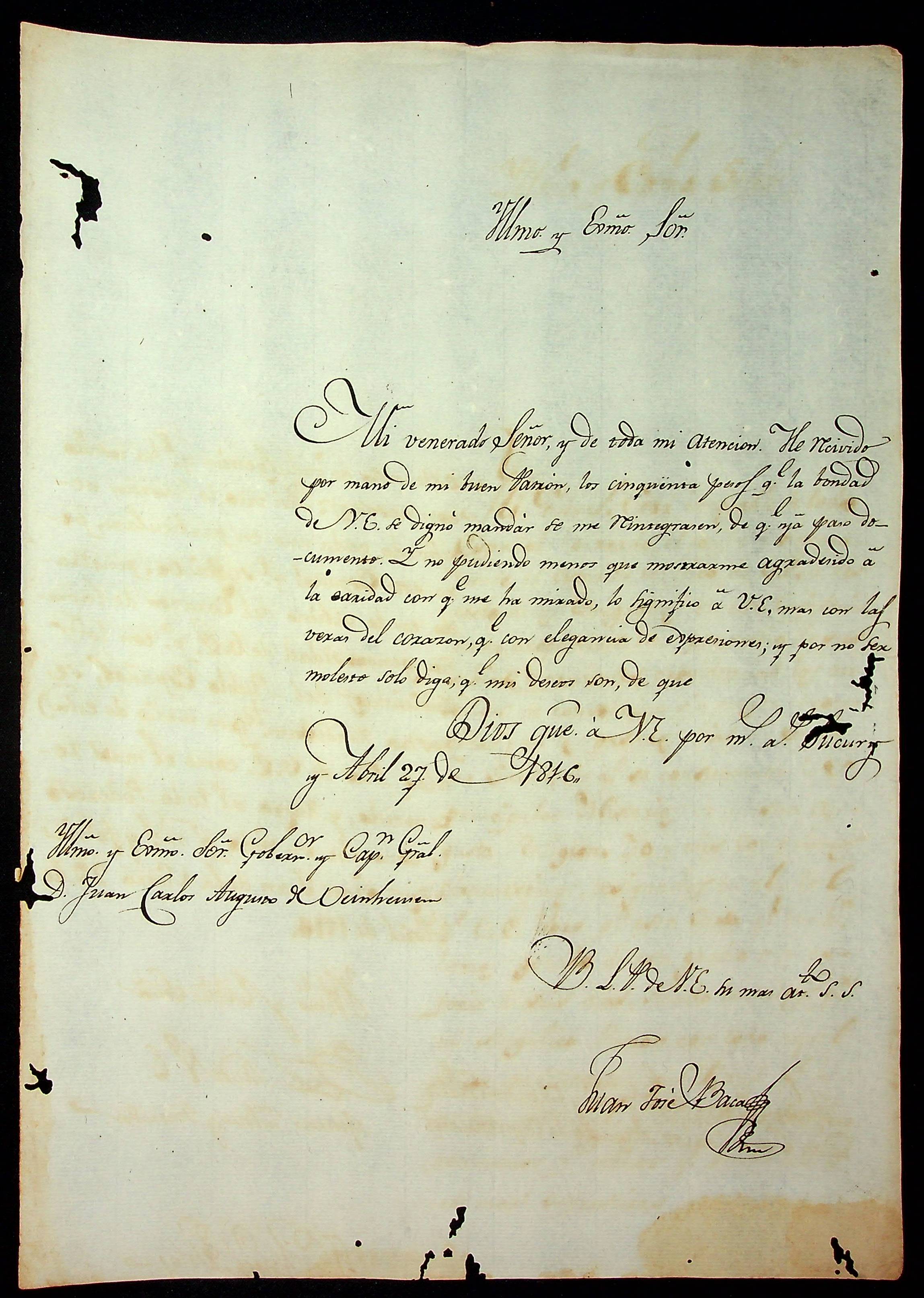 CARTA de Juan José Baca ao [Governador e Capitão-General da Capitania de Mato Grosso] João Carlos Augusto D’Oeynhausen e Gravemberg.