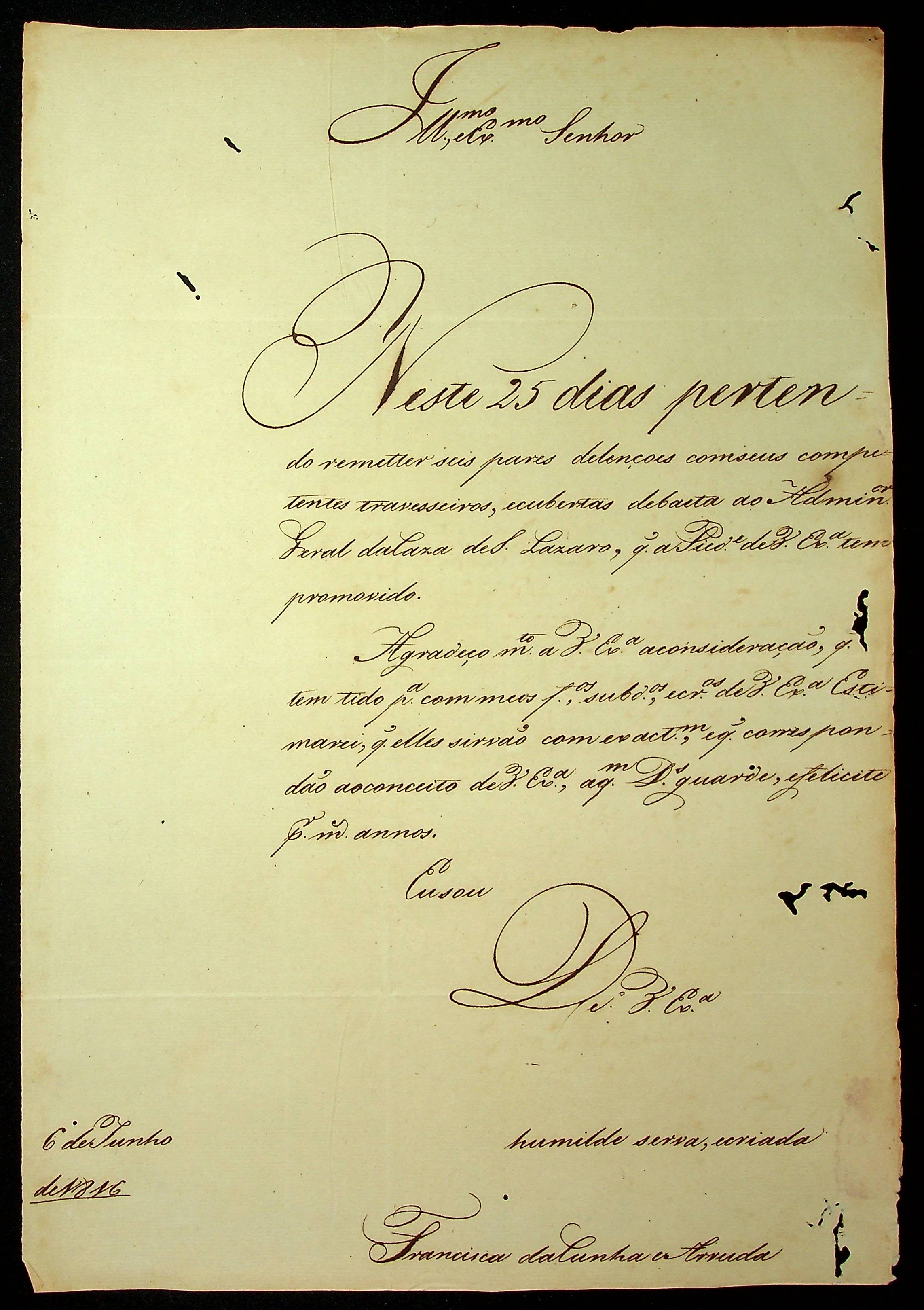 CARTA de Francisca da Cunha Arruda ao [Governador e Capitão-General da Capitania de Mato Grosso João Carlos Augusto D´Oeynhausen e Gravemberg].